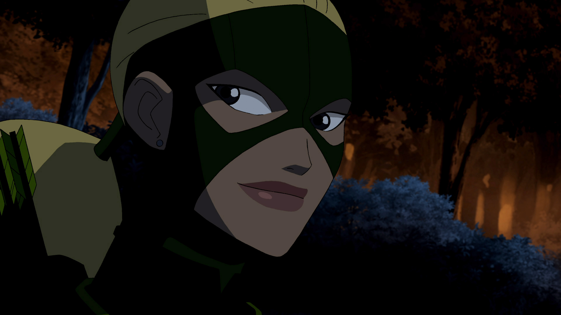 Description: A man in a green mask and a forest background with trees and bushes in the foreground.