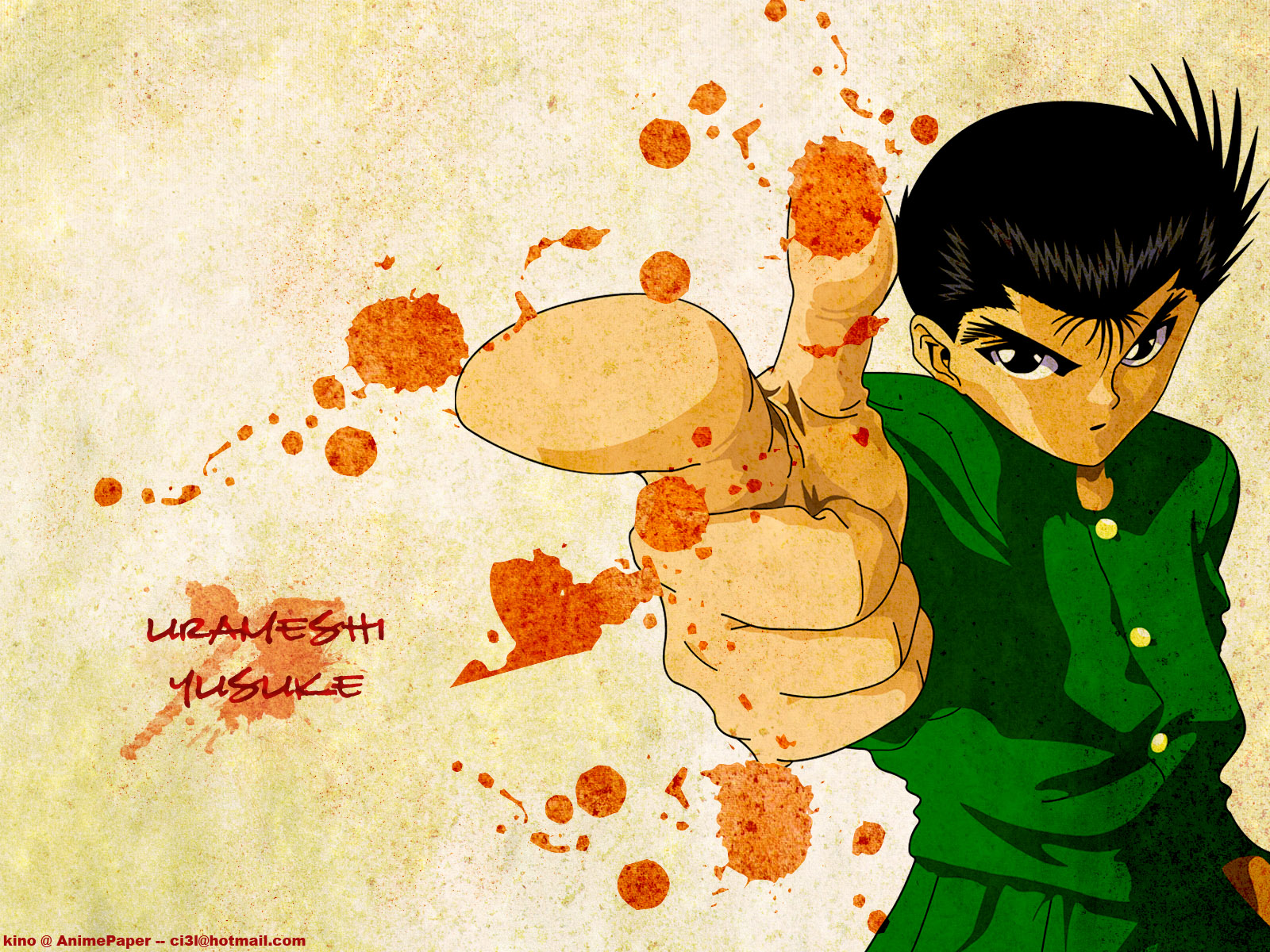 Description: A man with a green shirt and black hair pointing a finger at the camera with blood splatters all over the background.