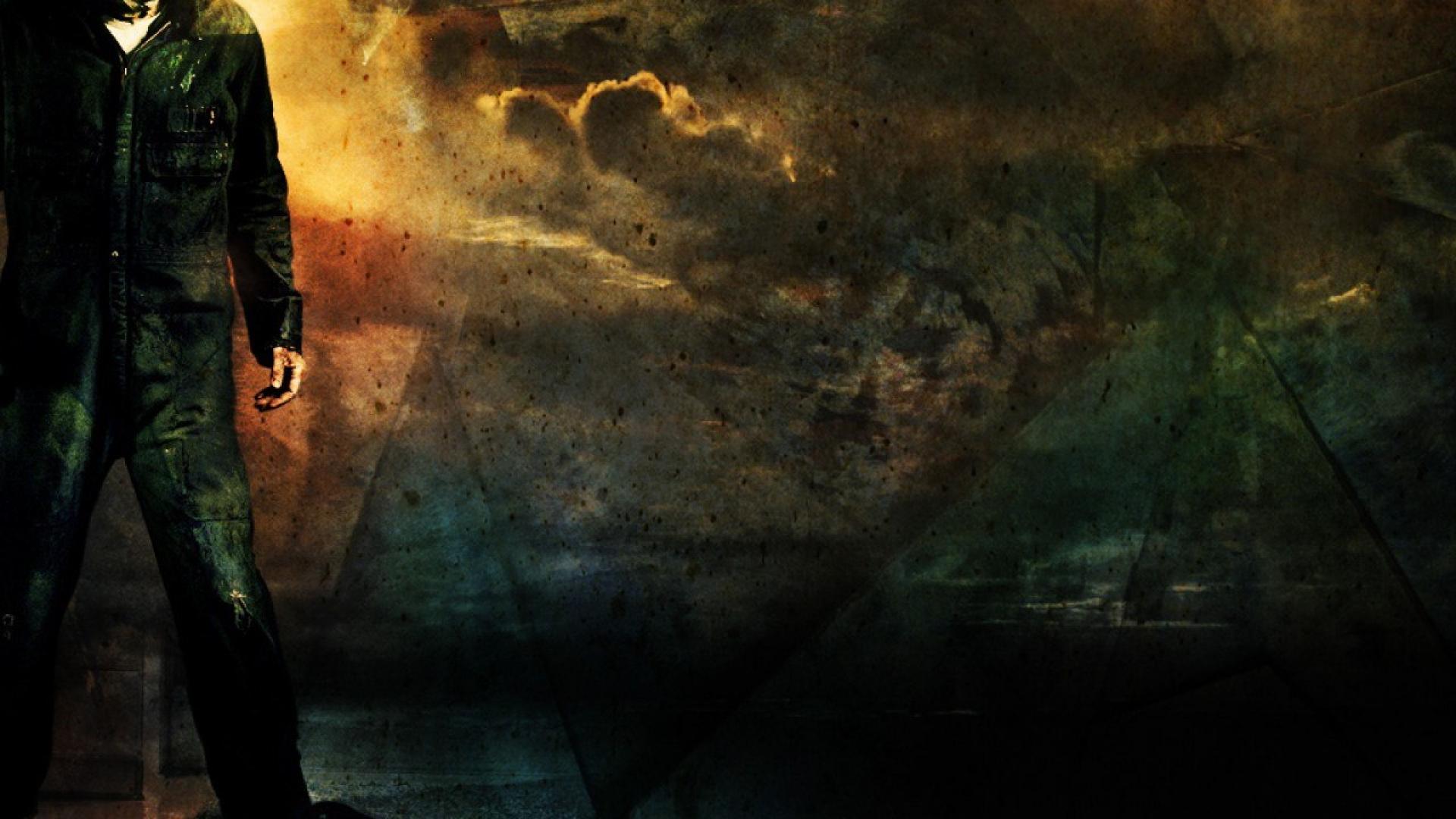Description: A man in a green suit standing in front of a painting of a sky and clouds with a knife in his hand.