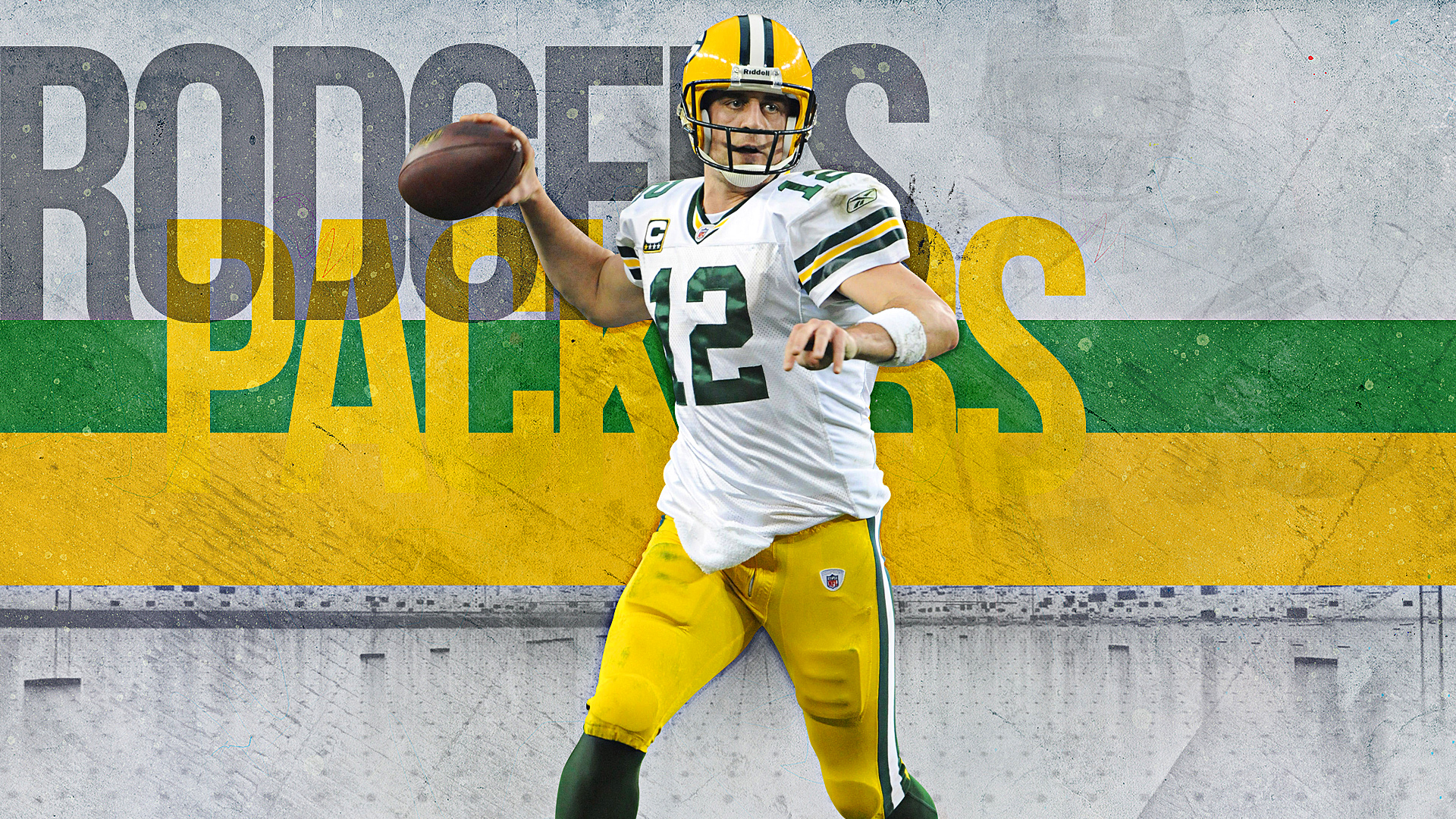 Description: A man in a green and yellow uniform holding a football in his right hand and a green and yellow striped wall behind him.