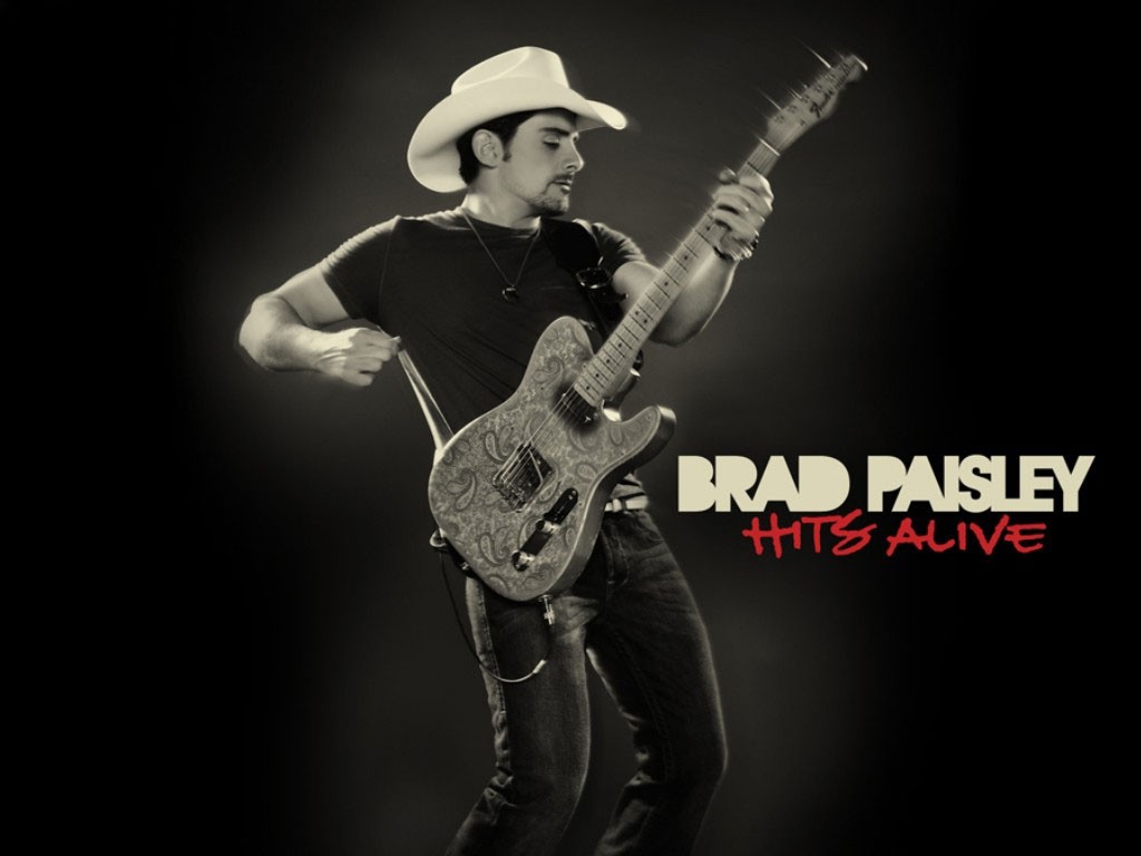 Description: A man with a guitar standing on a black background with the words brad paisleyy on it's back.