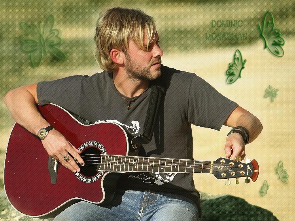 Description: A man sitting on a rock playing a guitar with a butterfly background behind him and a butterfly design on the wall behind him.