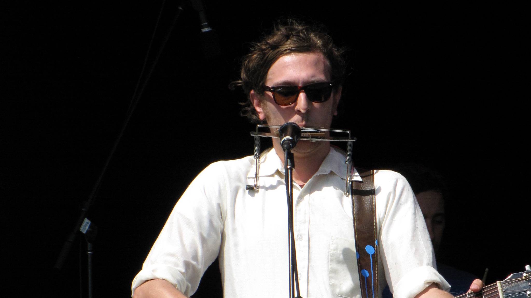 Description: A man with a guitar and a microphone on stage at a concert or festival.