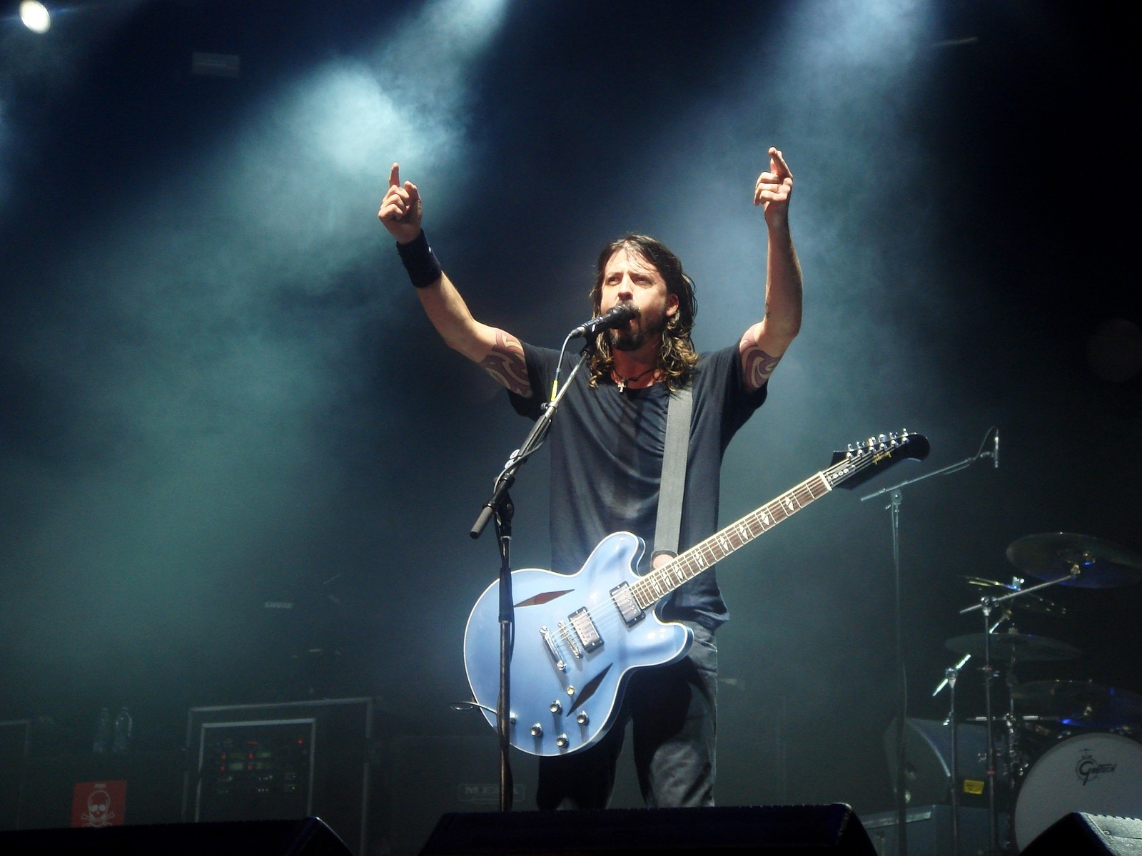 Description: A man with a guitar on stage with his hands up in the air and his arm raised up in the air.