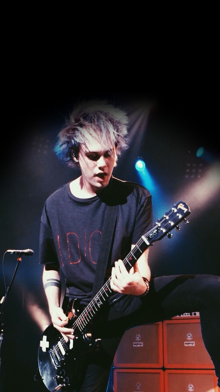 Description: A man with a guitar on stage with a microphone and a microphone stand behind him and a microphone in front of him.