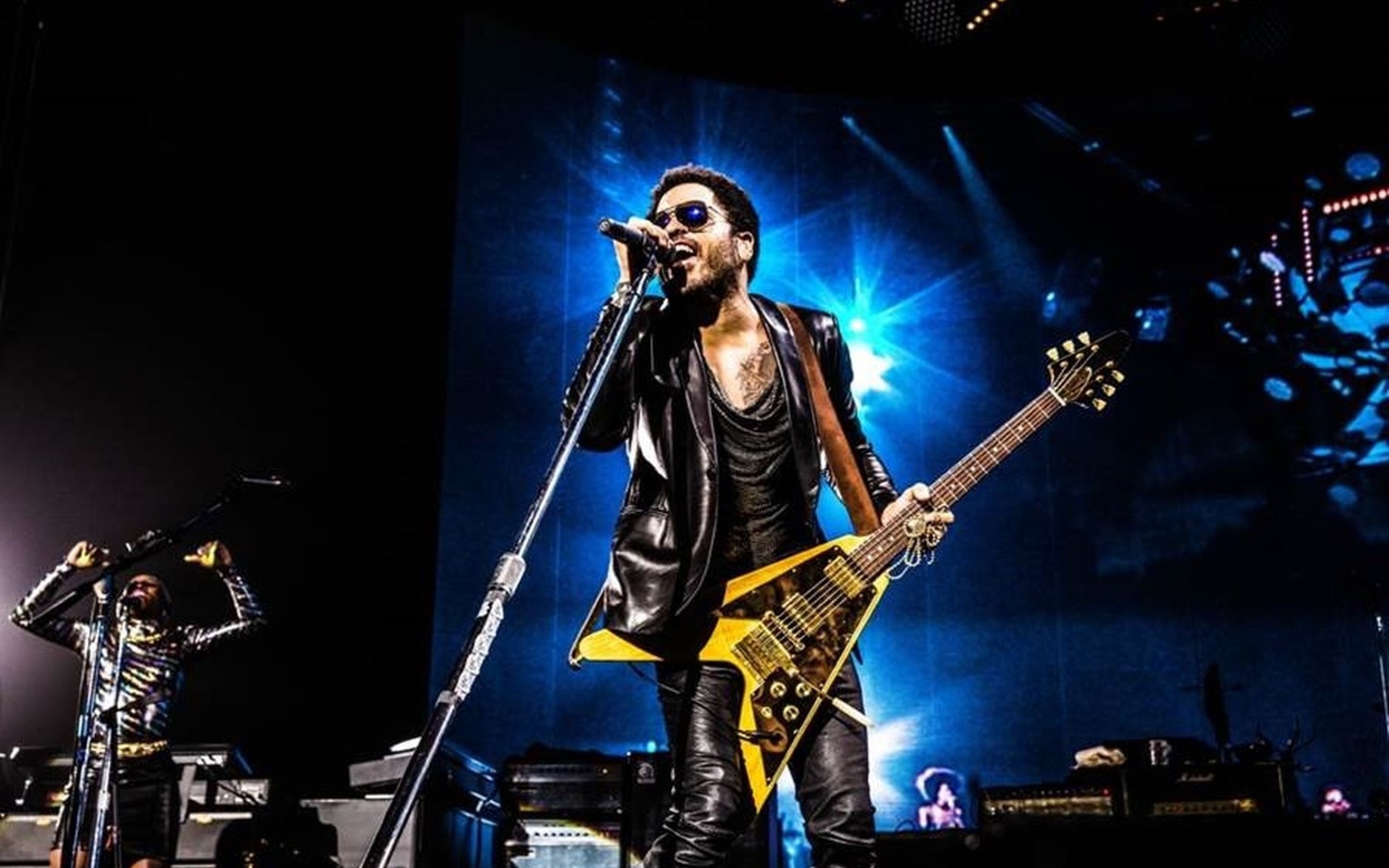 Description: A man with a guitar on stage with a microphone and a microphone stand behind him and a guitar in front of him.