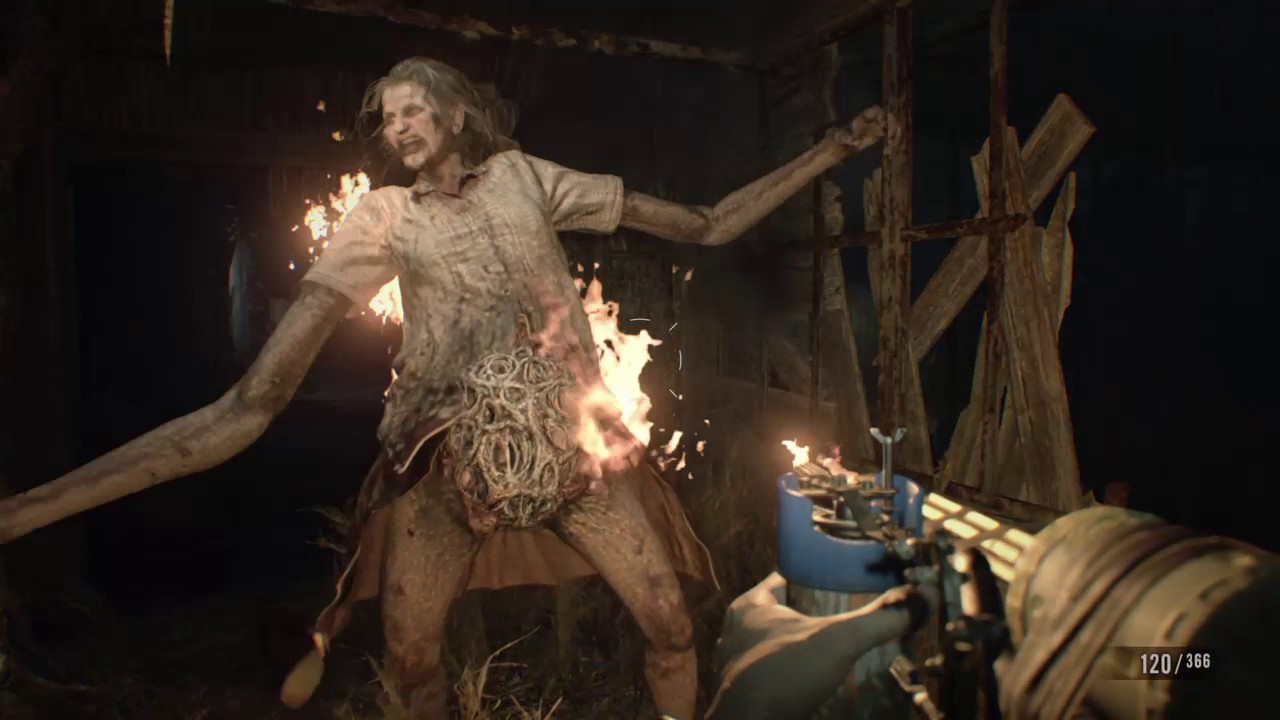 Description: A man with a gun and a fire in his hand in a dark room with fire coming out of his mouth.