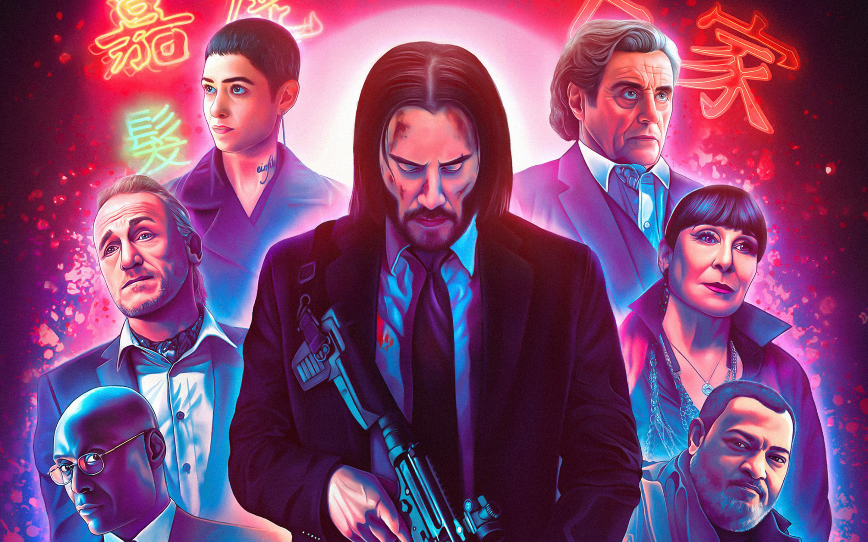 Description: A poster of a man with a gun in his hand and a group of people in the background with neon lights.