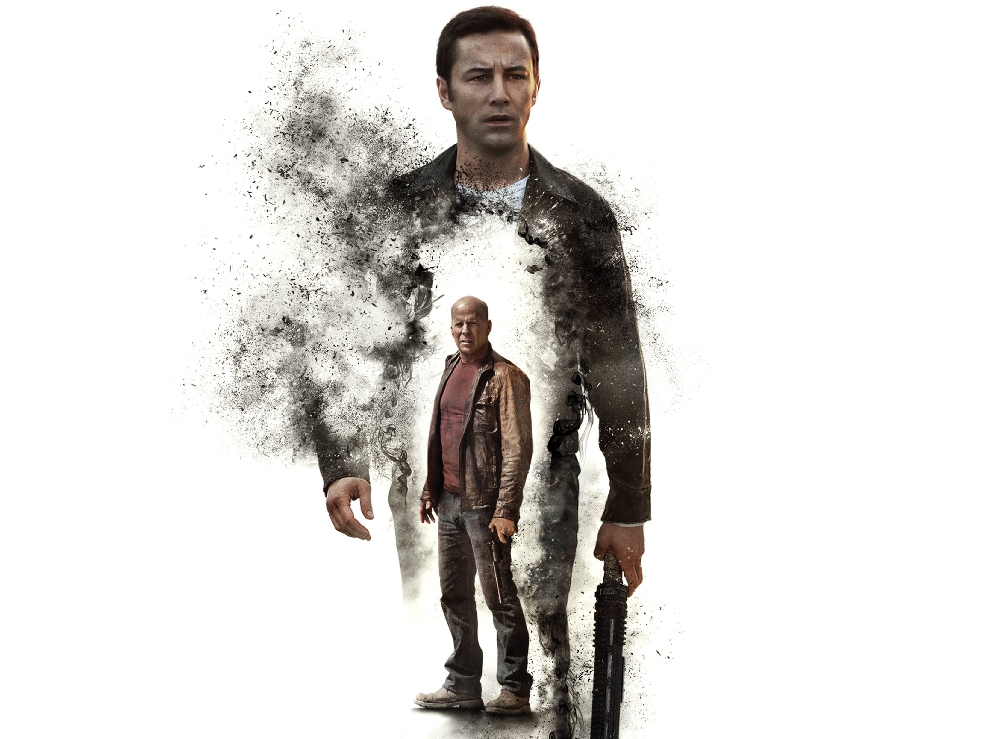 Description: A man holding a gun in front of a white background with smoke coming out of his body and a man standing behind him.