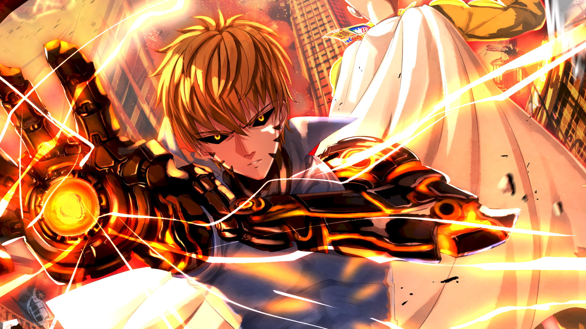 Description: A man holding a gun in his right hand and a woman in the background with a lightening arm.