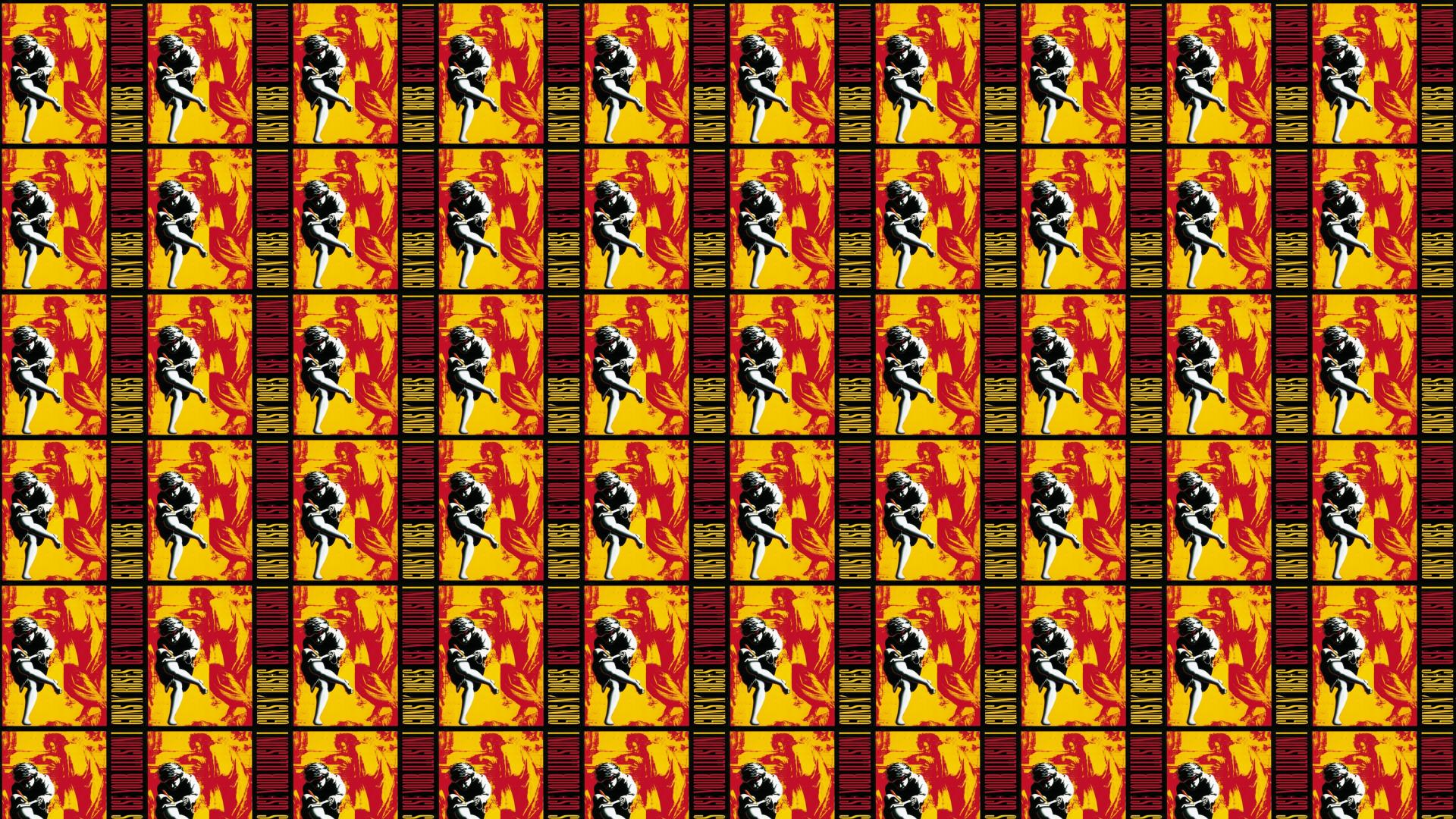 Description: A pattern of a man with a gun on a yellow background with red and yellow squares and a black and yellow background.
