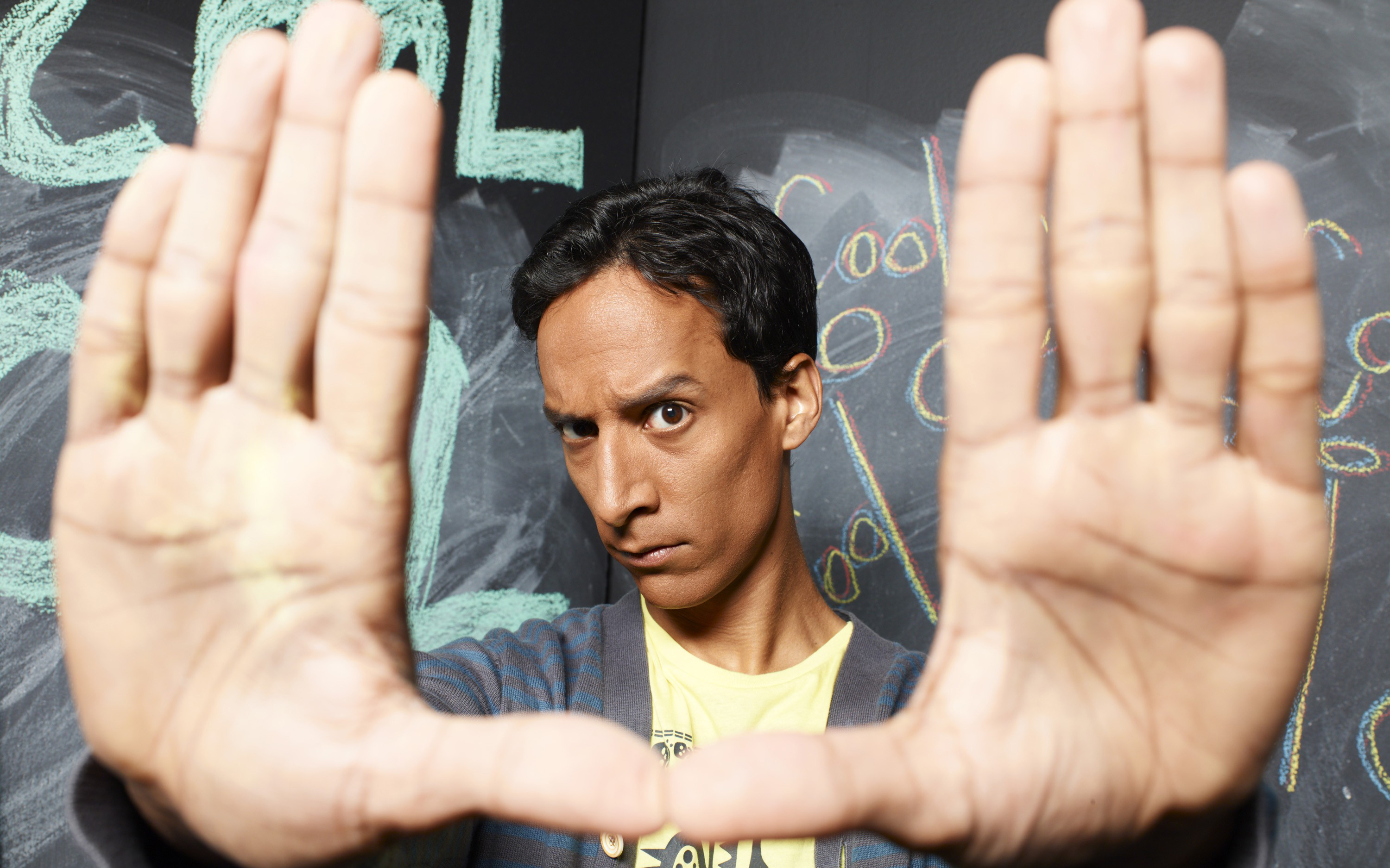 Description: A man is making a hand gesture in front of a chalkboard with chalk writing on it and a chalkboard behind him.
