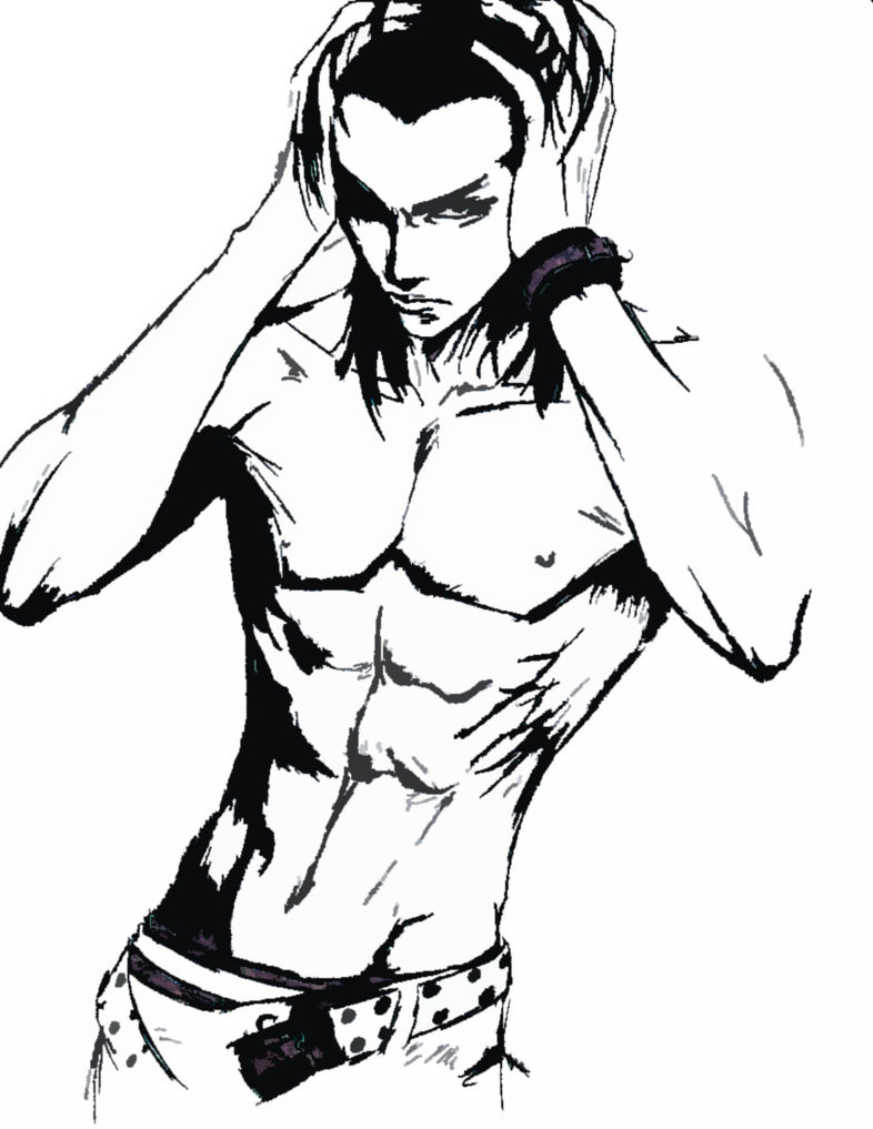 Description: A drawing of a man with his hands on his head and his shirt off.