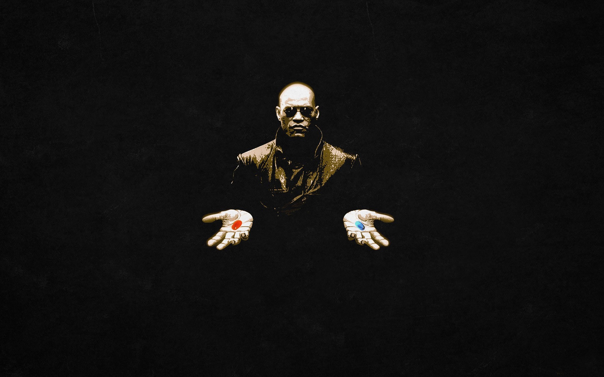 Description: A man with his hands out in the dark with a red dot on his left hand and a black background.