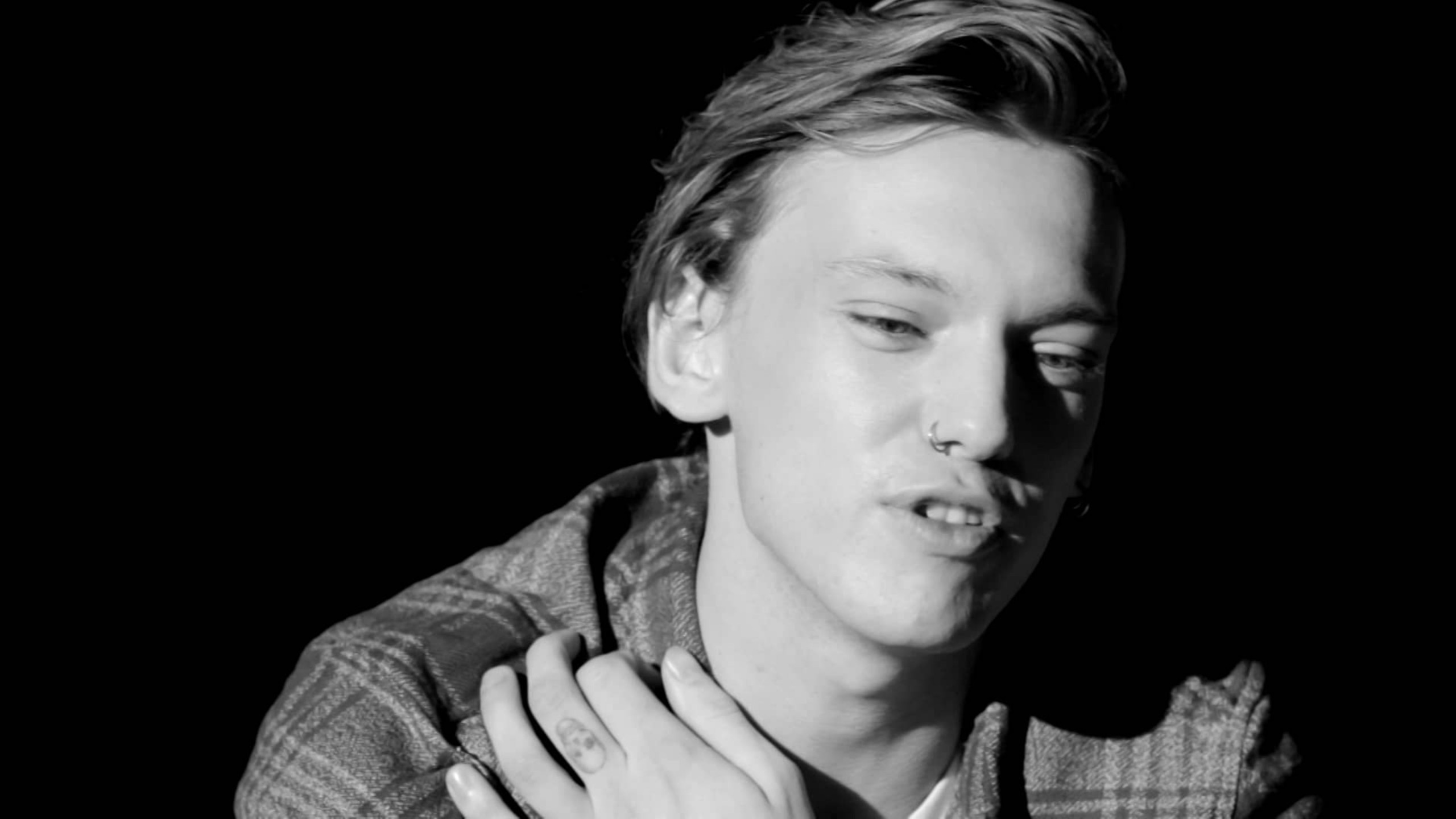 Description: A man with his hands together in a black and white photo with a black background and a black background.