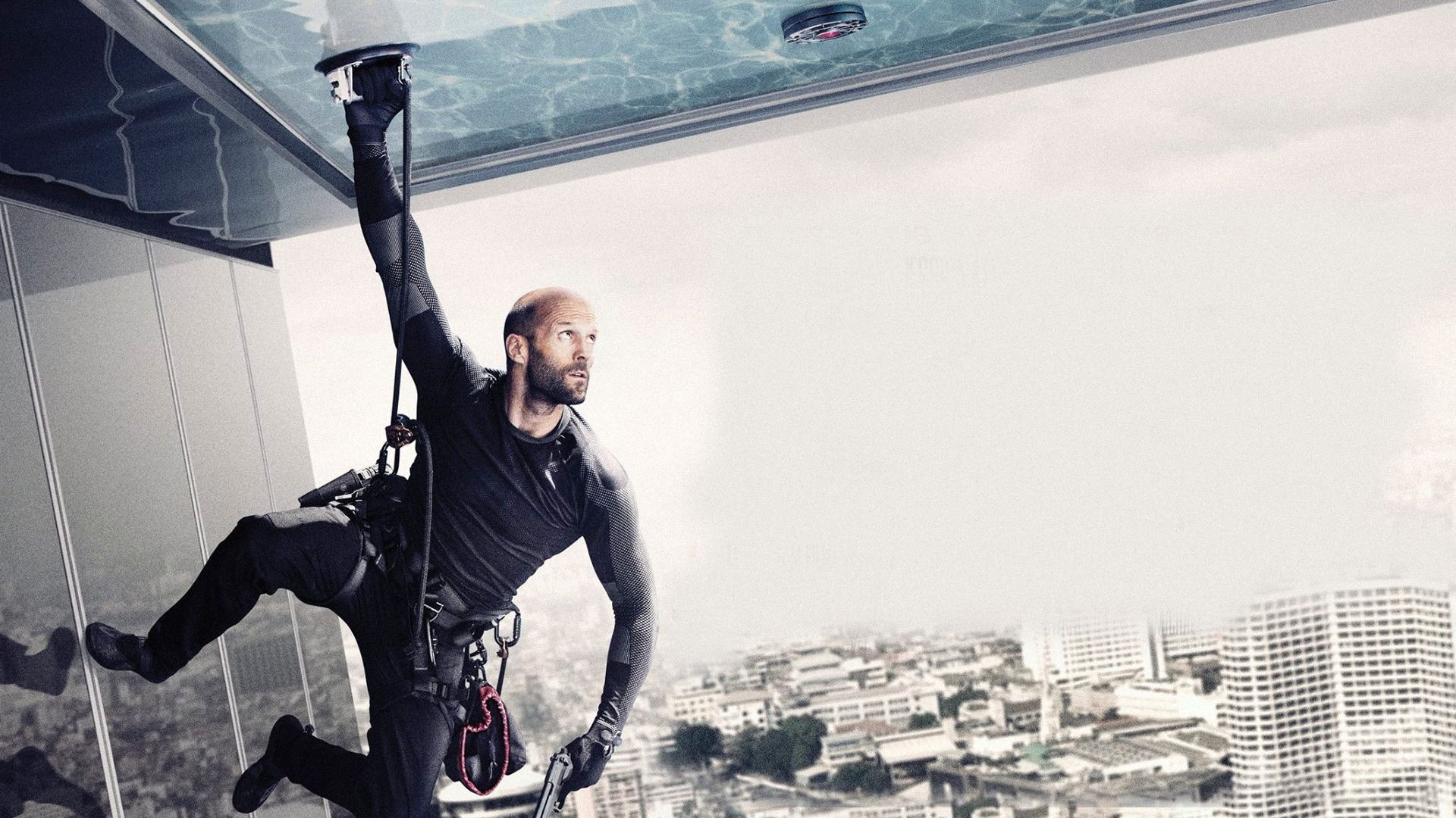 Description: A man hanging from a high rise window with a city in the background and a sky line in the foreground.
