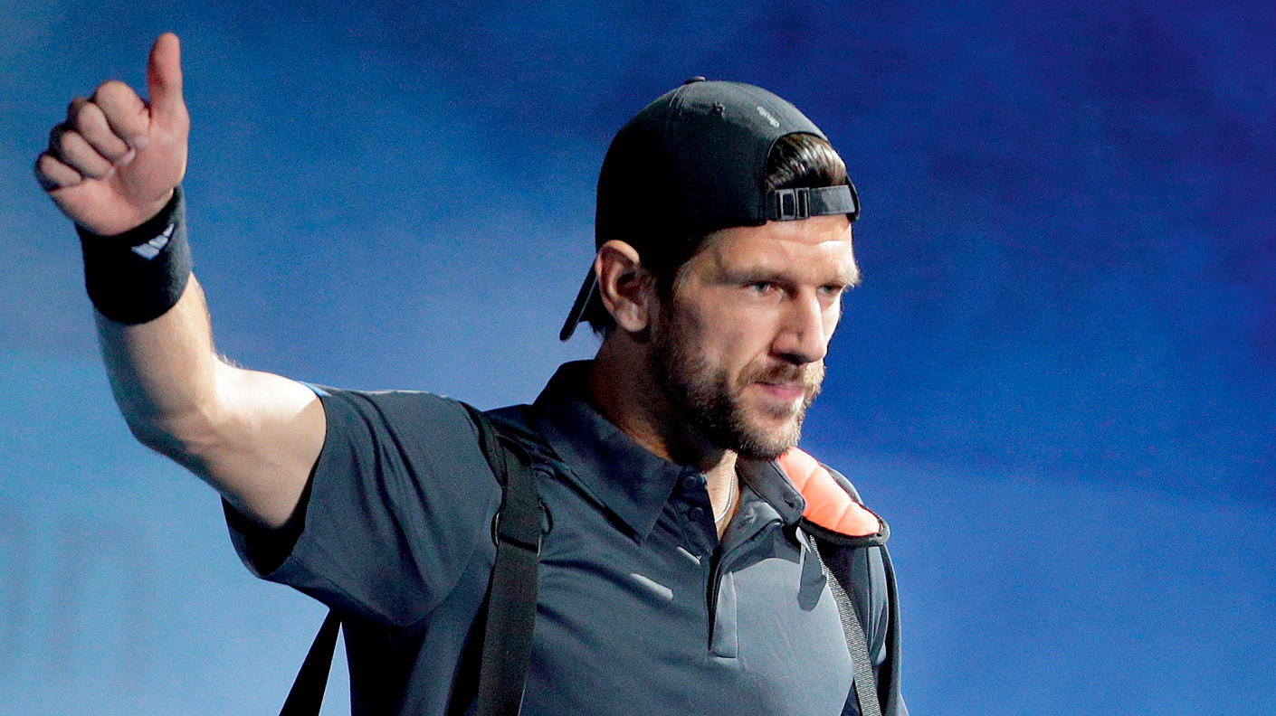 Description: A man with a hat and a black shirt is holding his arm up in the air and wearing a black hat.