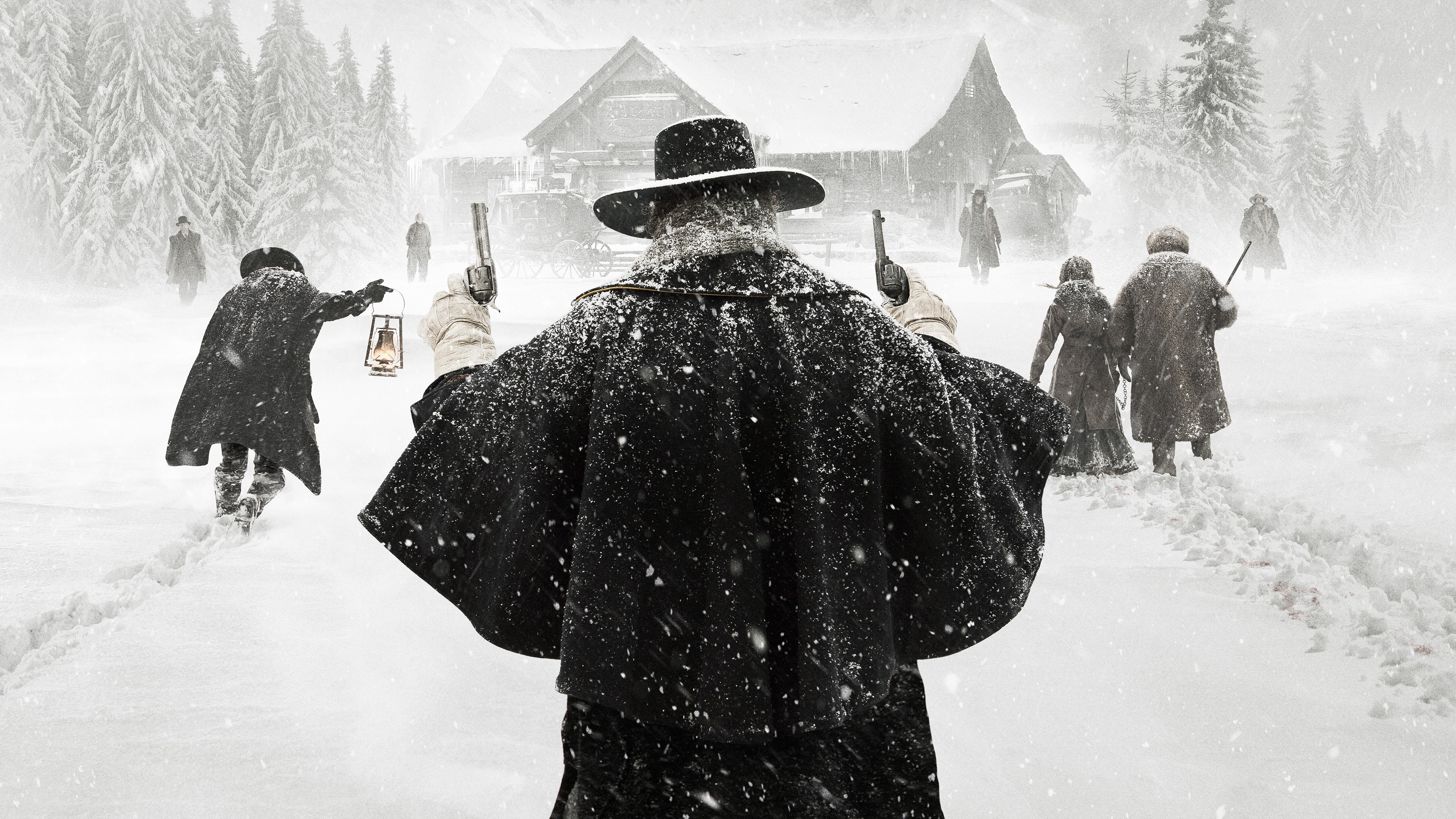 Description: A man in a hat and coat is walking through the snow with a lantern in his hand and a group of people behind him.