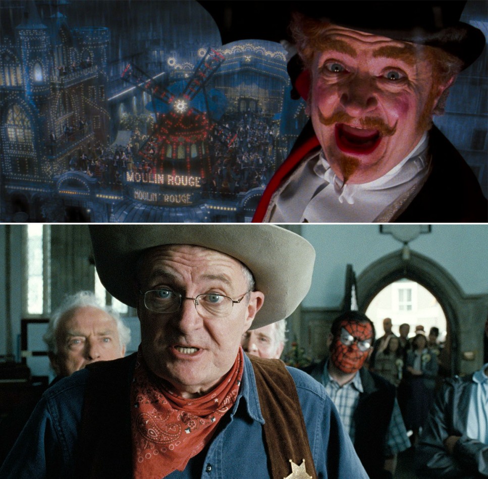Description: Two pictures of a man with a hat and a fake face in the same picture and a picture of a man with a fake face in a hat.