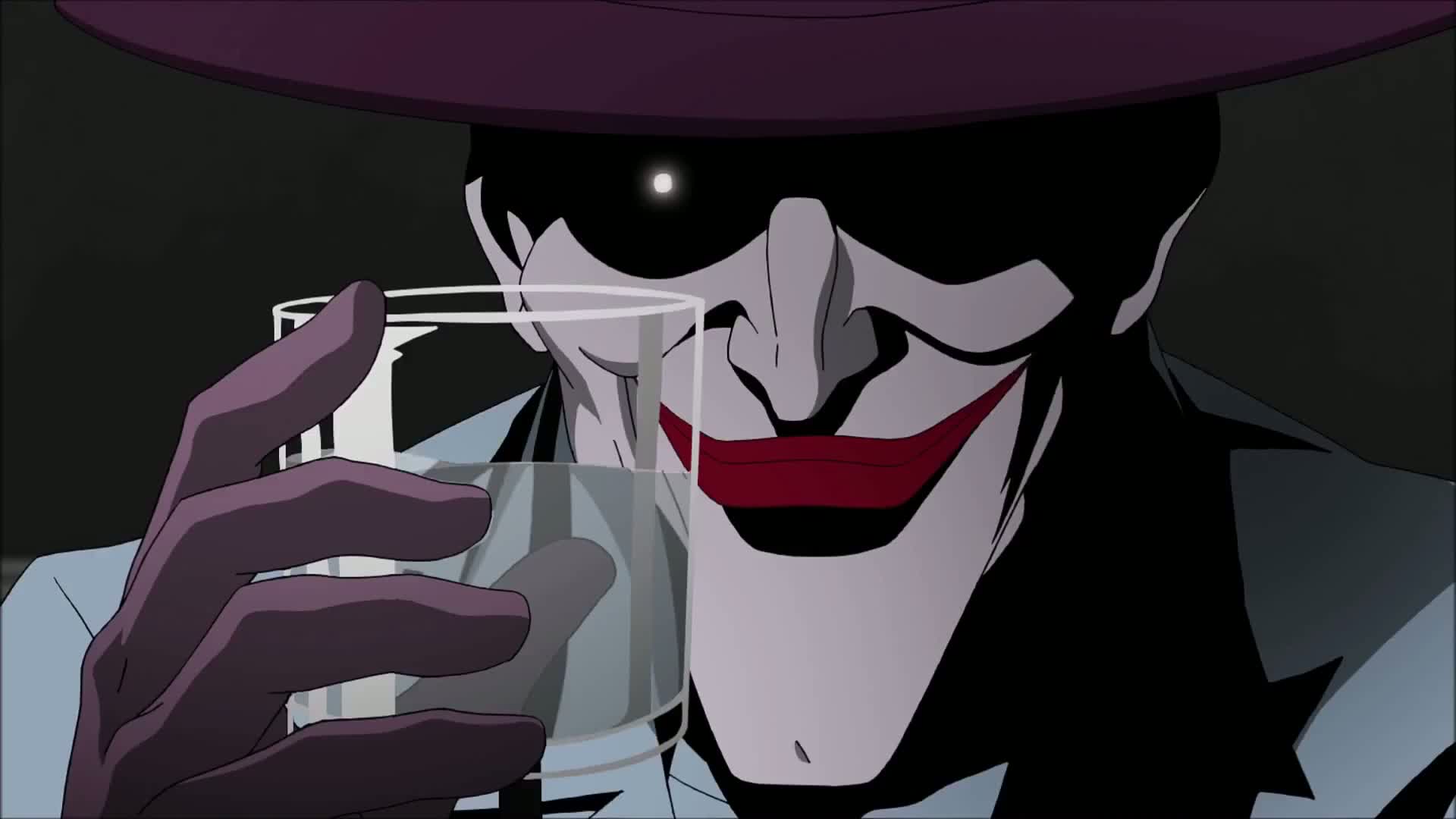Description: A man in a hat holding a glass of liquid with a creepy face on it and a creepy expression on his face.