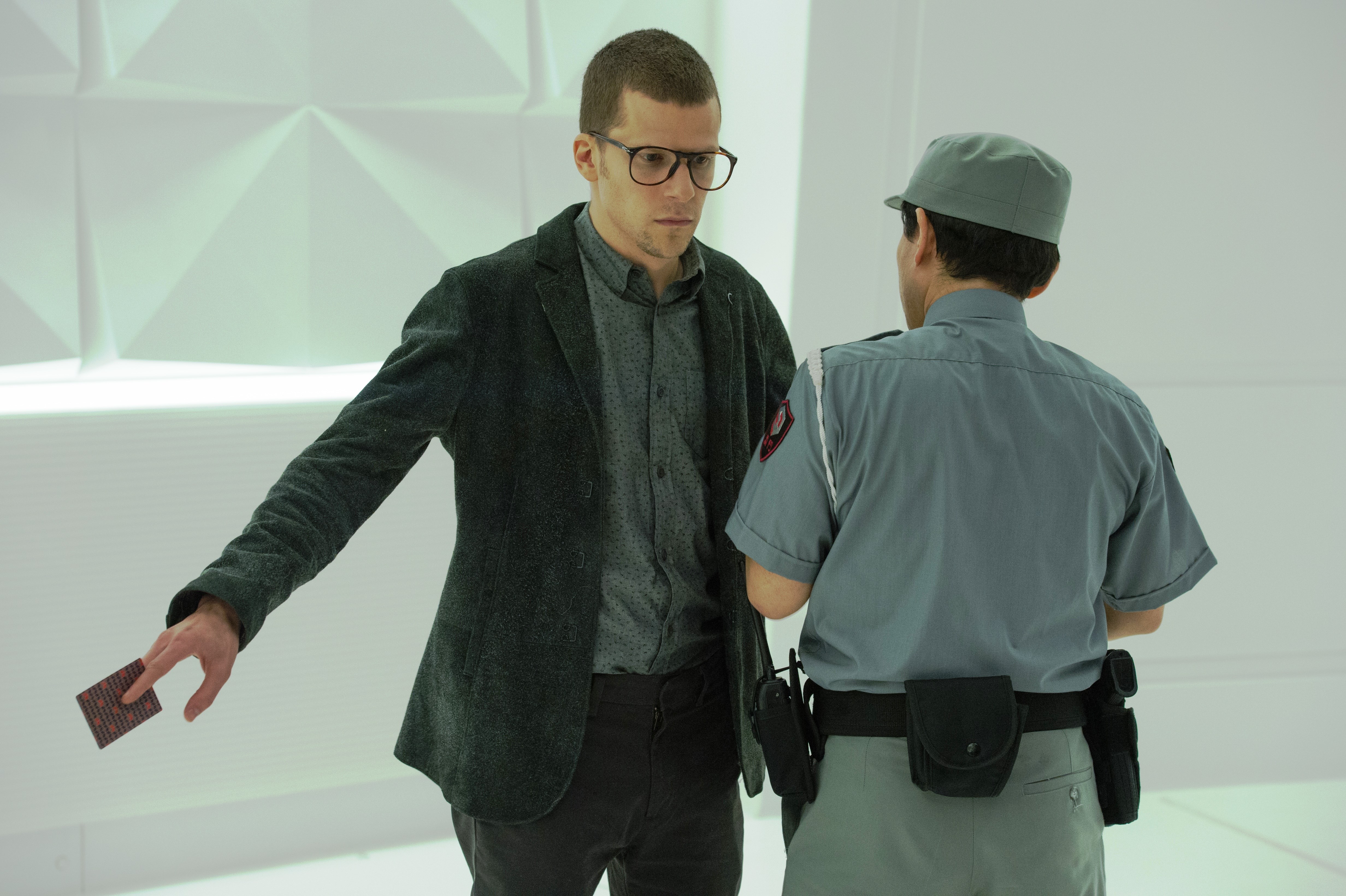 Description: A man in a hat and glasses talking to another man in a suit and tie with a gun in his hand.