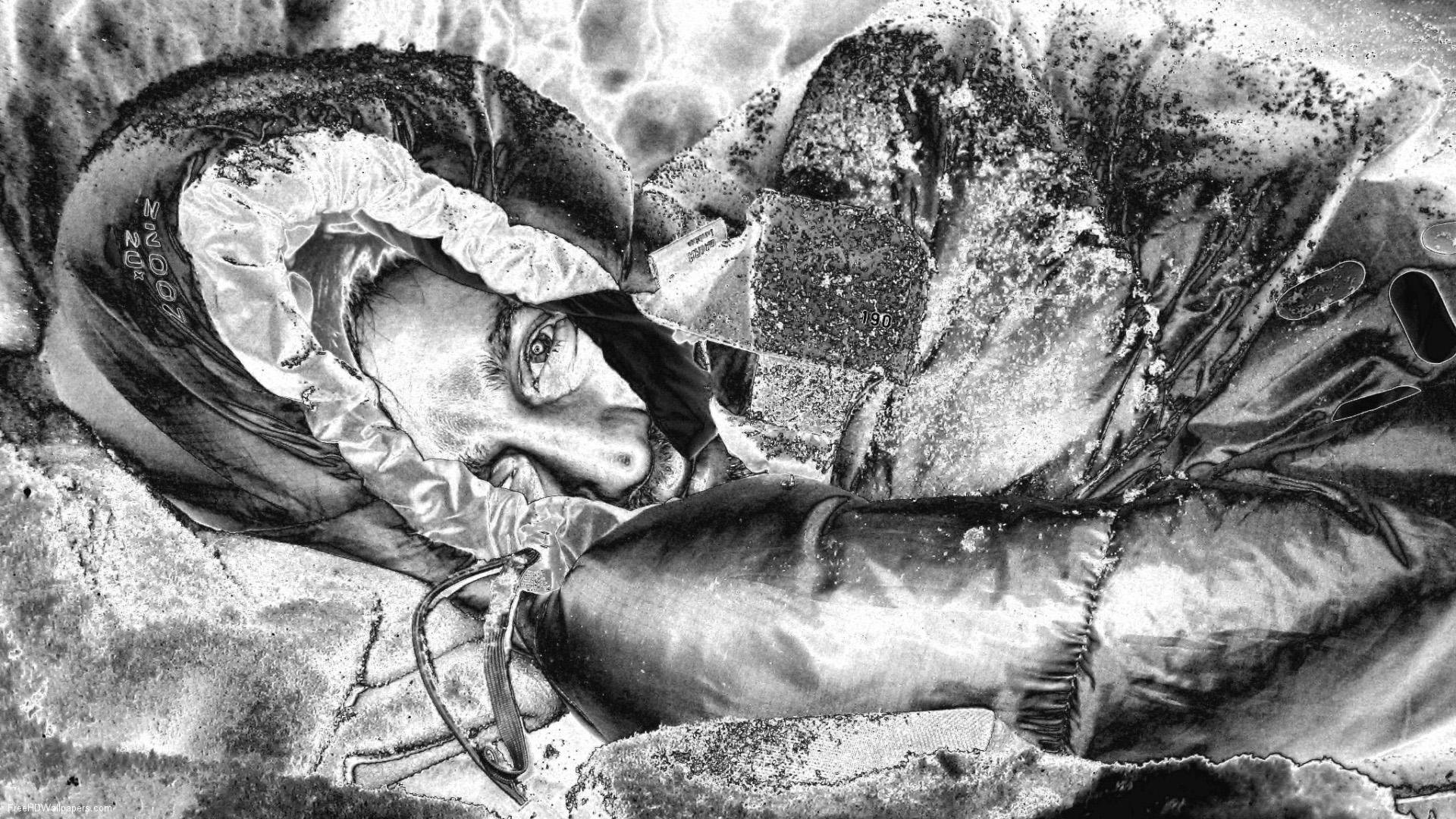 Description: A drawing of a man in a hat and a jacket with a horse's head sticking out of it.