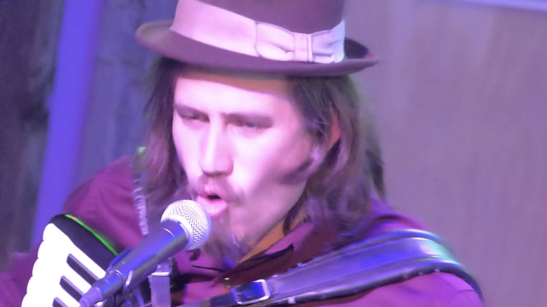 Description: A man with a hat and a microphone in front of a microphone stand with a keyboard on it and a microphone in his mouth.