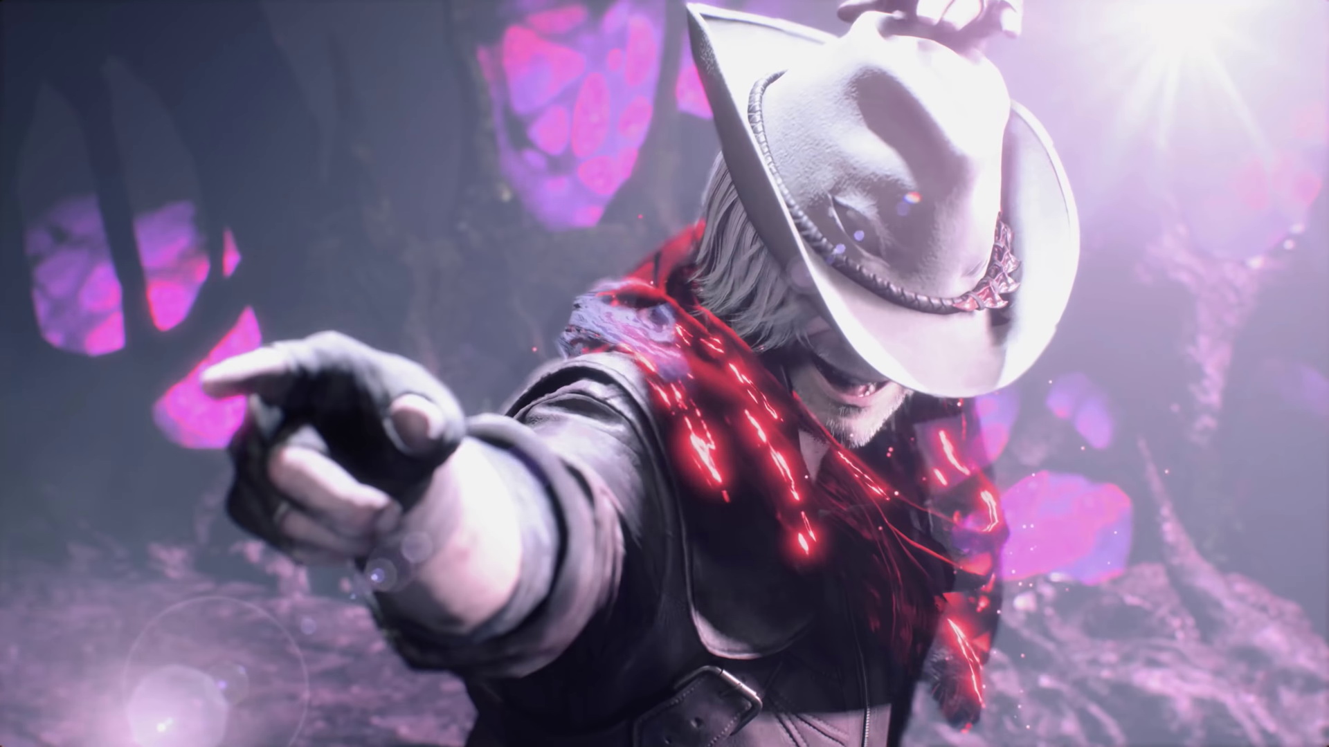Description: A man in a hat pointing at something with his finger in the air and a light shining on his face.