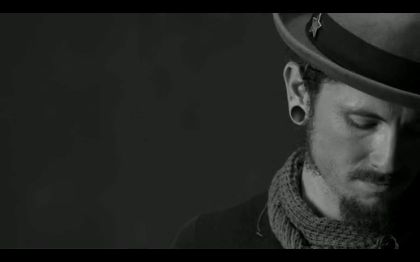 Description: A man with a hat and scarf around his neck looking down at his earrings and wearing a scarf around his neck.