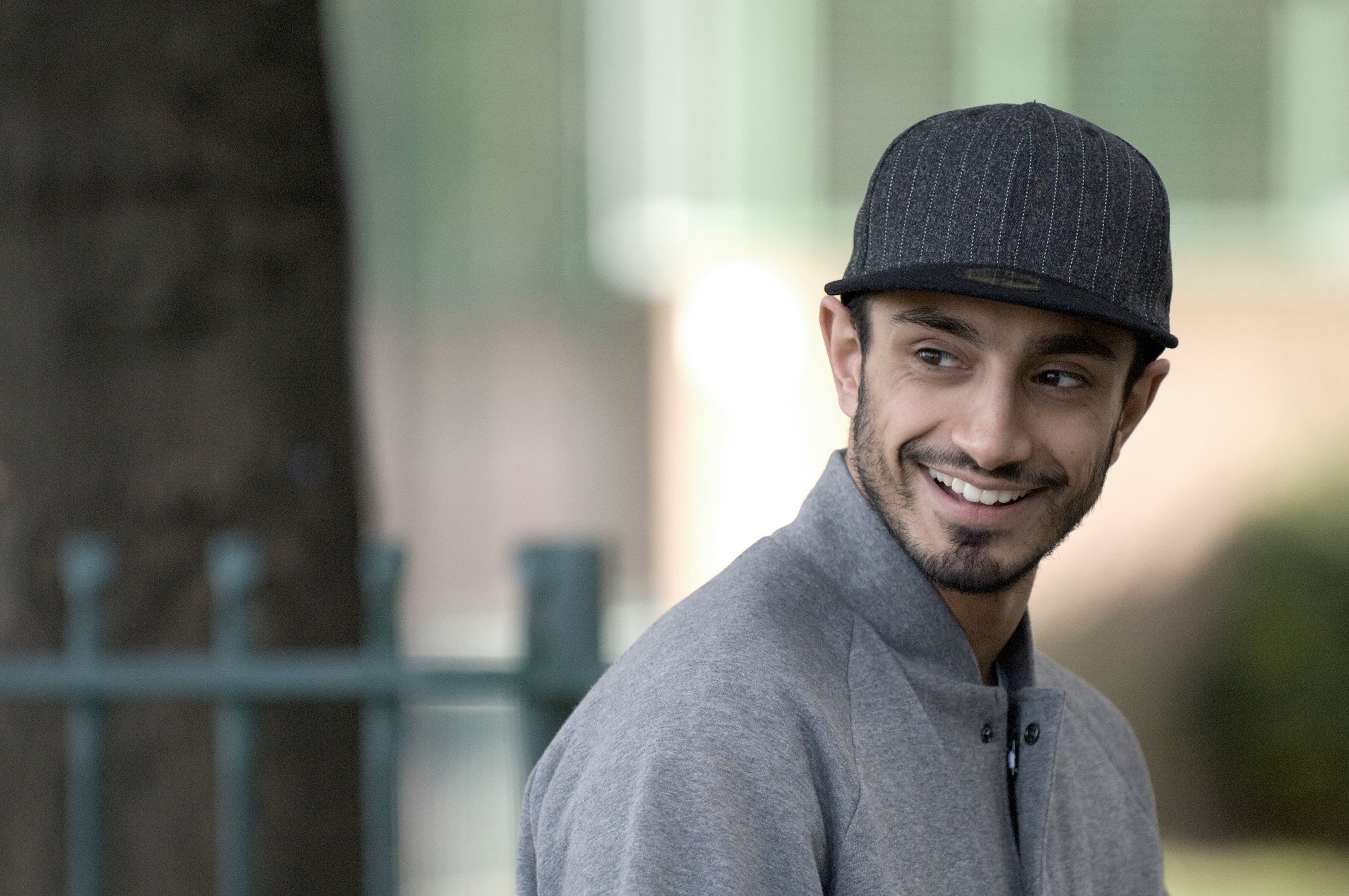 Description: A man with a hat on smiling for the camera with a tree in the background in a city setting.