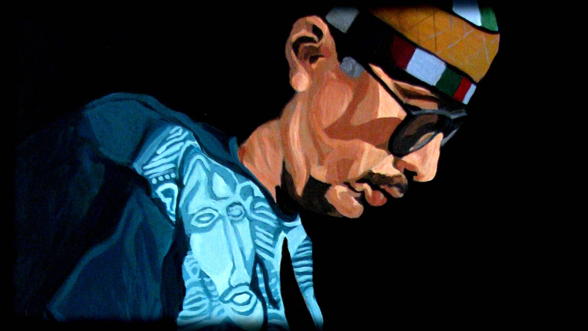 Description: A painting of a man wearing a hat and sunglasses with a black background and a black background with a black background.