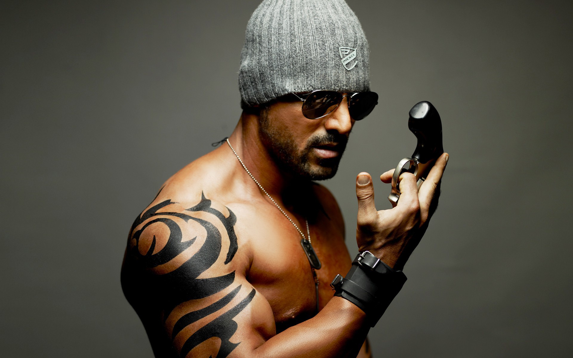 Description: A man with a hat and sunglasses holding a cell phone in his hand and a tattoo on his arm.
