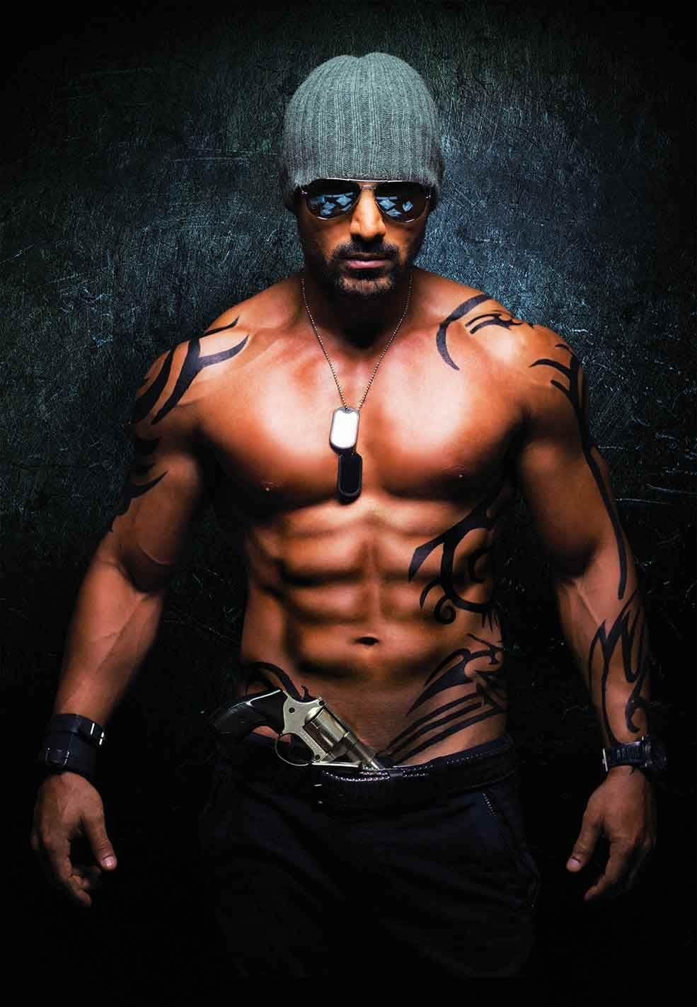 Description: A man with a hat and sunglasses on his head and a gun in his hand and a gun in his other hand.