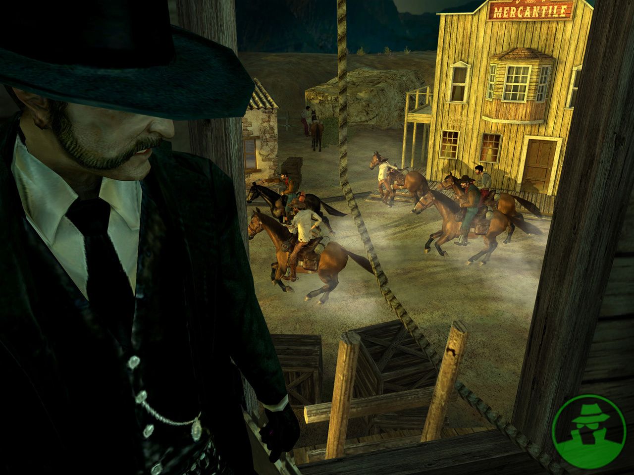 Description: A man in a hat and tie on a horse in a western town with a building and a horse.