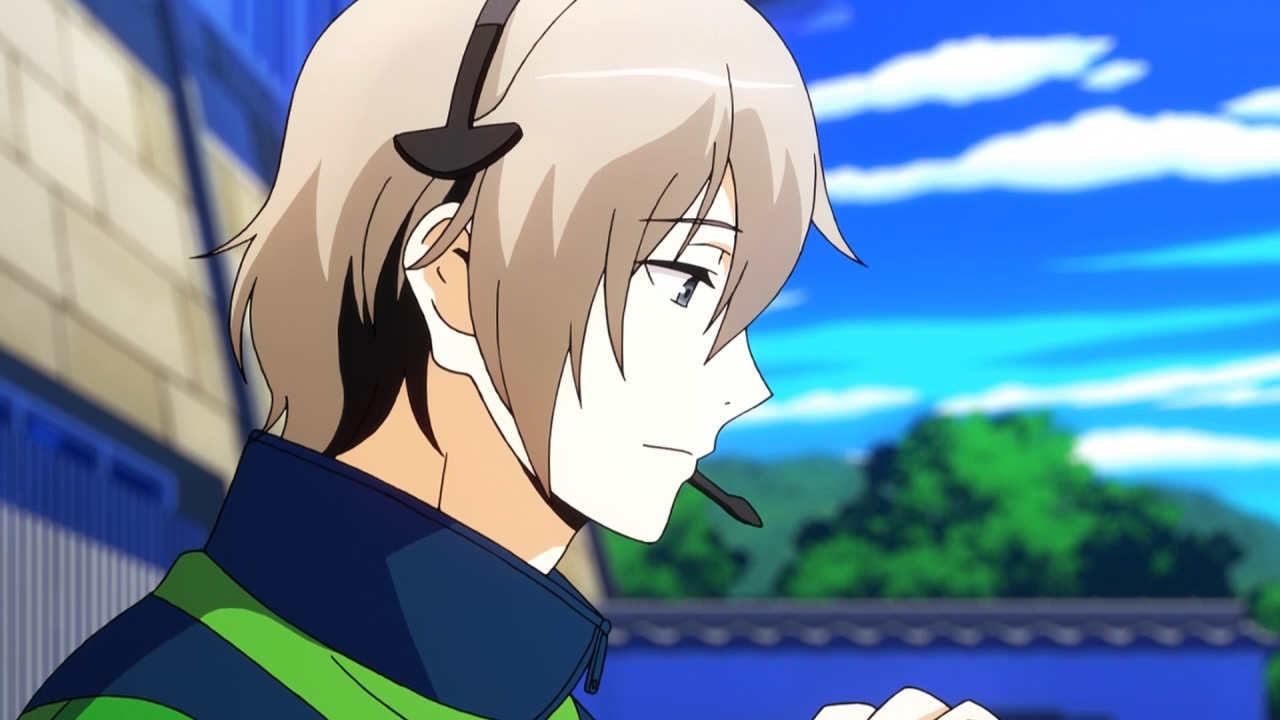 Description: A man with a headset on looking at something in the distance with trees in the background and a building in the foreground.