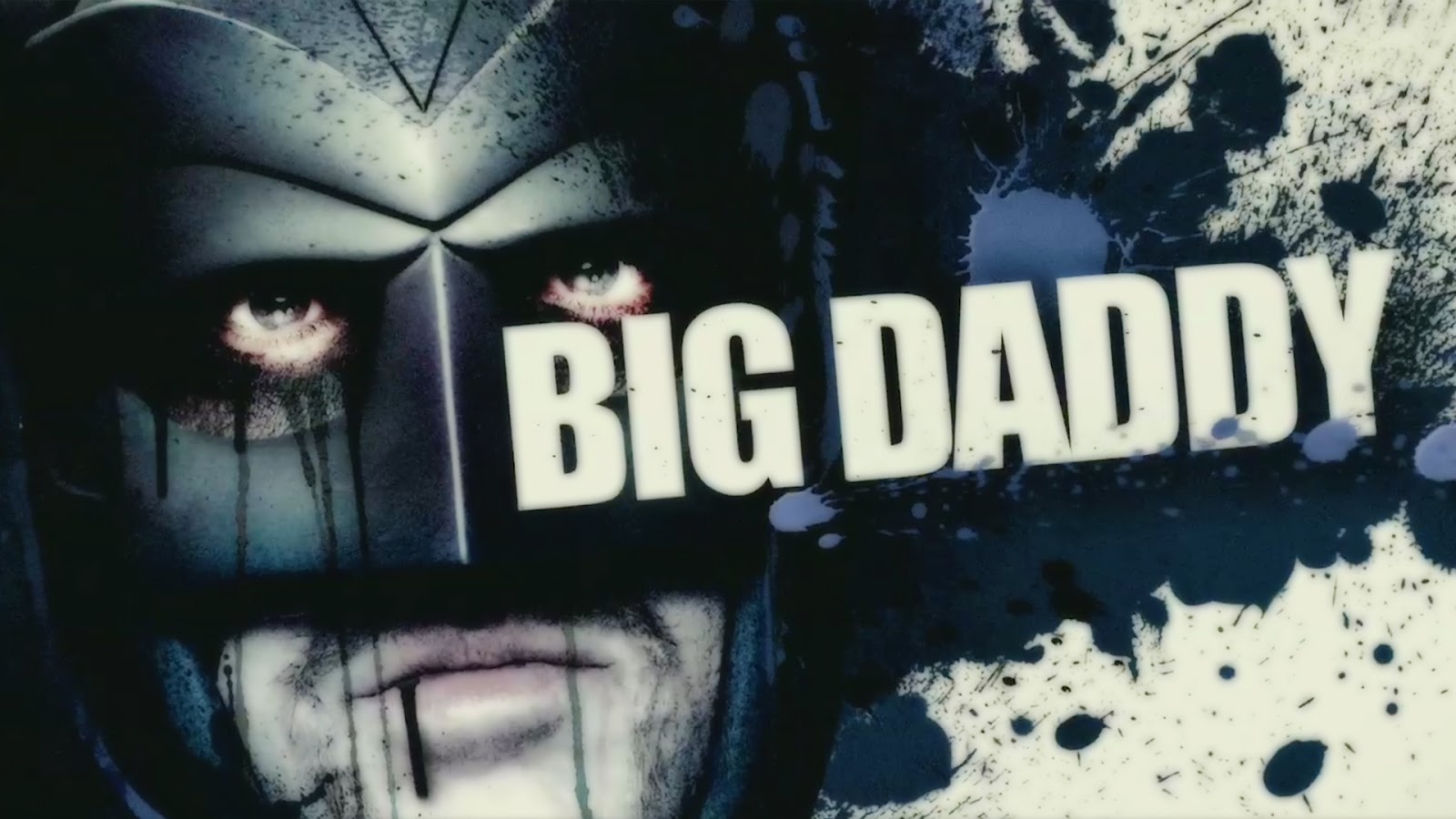 Description: A man in a helmet with the words big daddy on it's face and a paint splattered background.