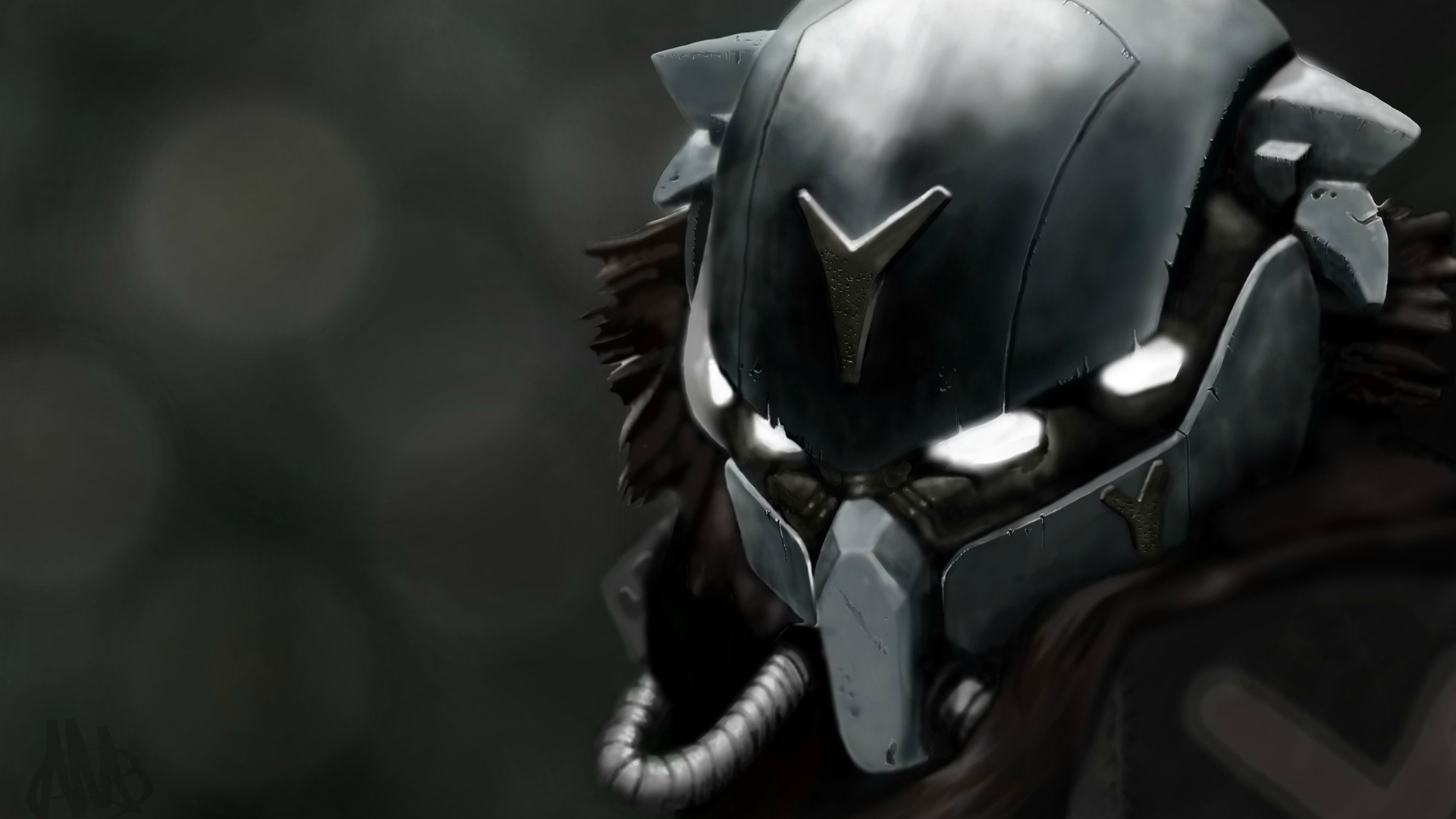 Description: A man in a helmet with a large face and a black coat with a hood on it's head.