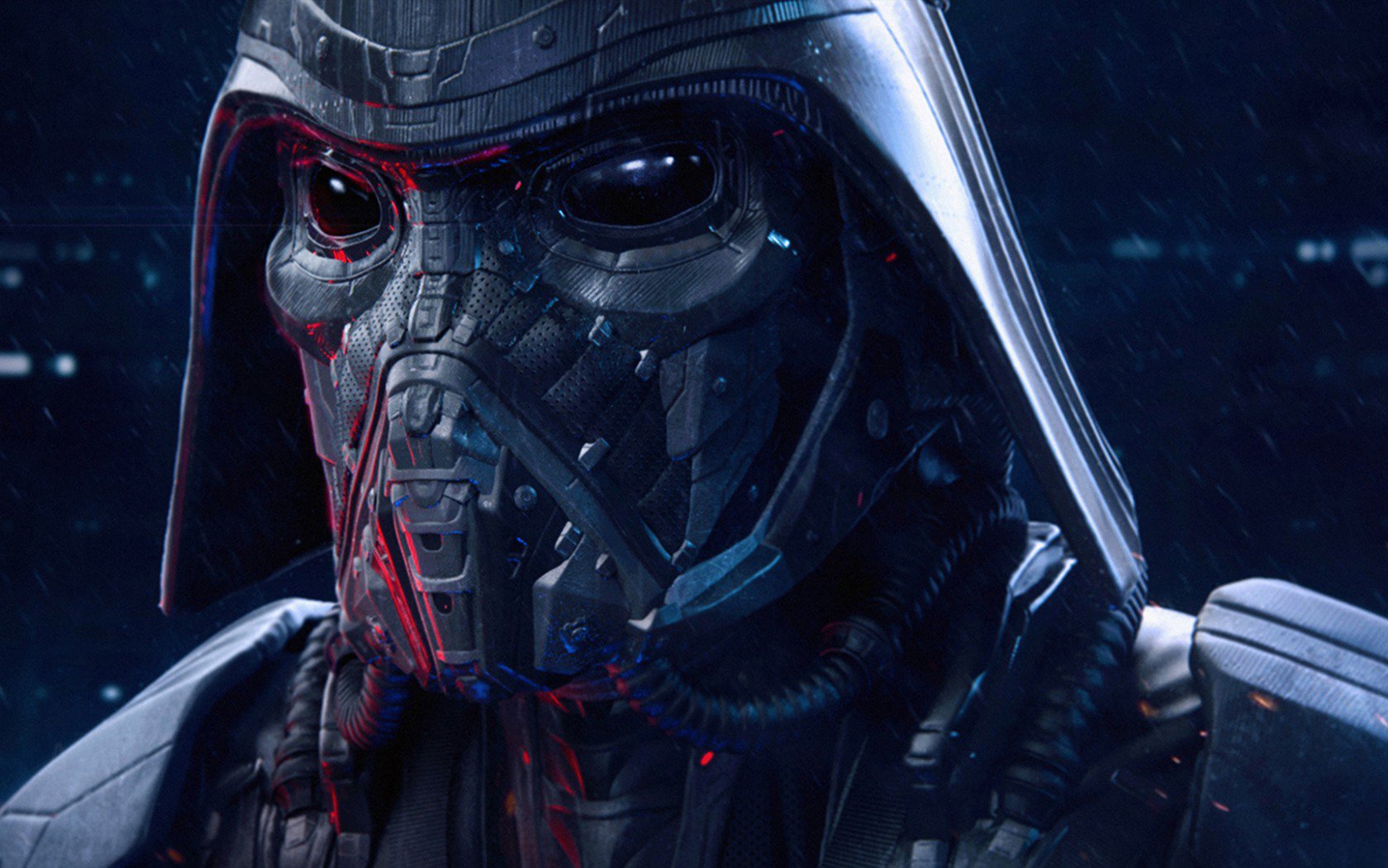 Description: A man in a helmet and a helmet with a red light on his face and a black background with a red light on his face.