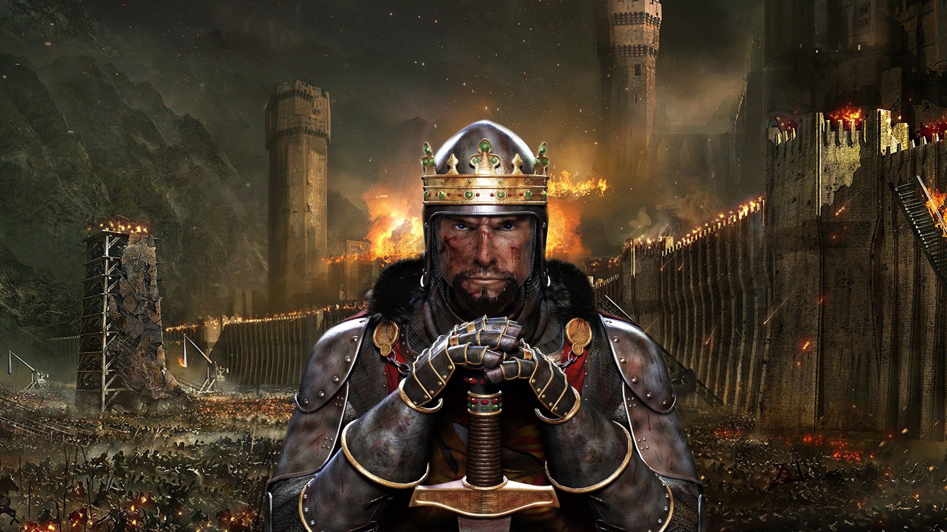 Description: A man in a helmet holding a sword in front of a city with flames and smokes in the background.