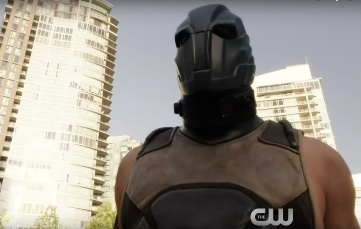 Description: A man in a helmet standing in front of a tall building in a city with tall buildings in the background.