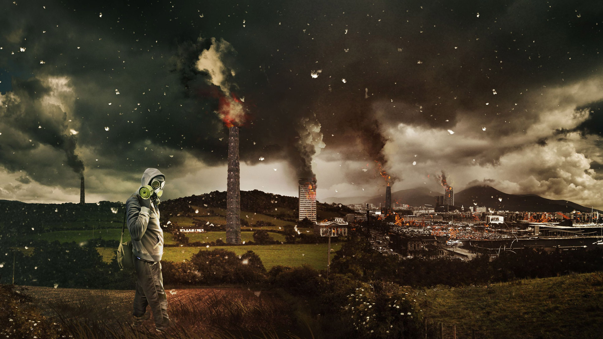 Description: A man standing on a hill with a factory in the background and smoke billowing from the stacks of buildings.