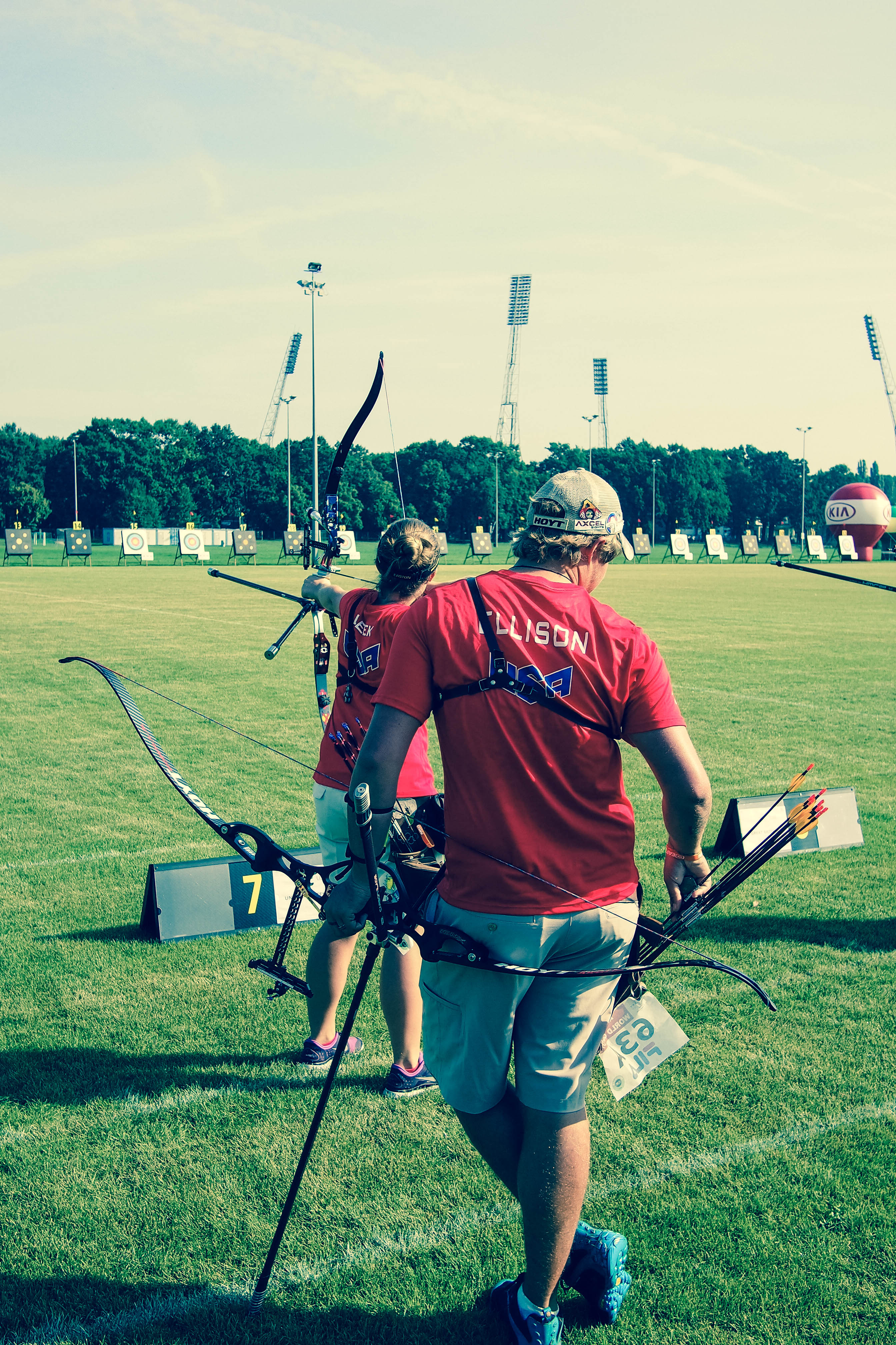 Description: A man holding a bow and arrow in a field of grass with other people watching from behind him and a field of lights in the background.