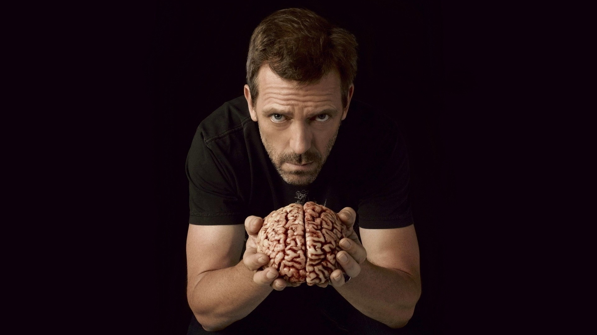 Description: A man holding a brain in his hands with a black background behind him and a black background behind him.