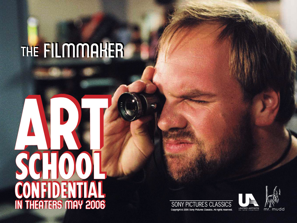 Description: A man holding a camera up to his face with the words art school continental in front of him and a poster behind him.