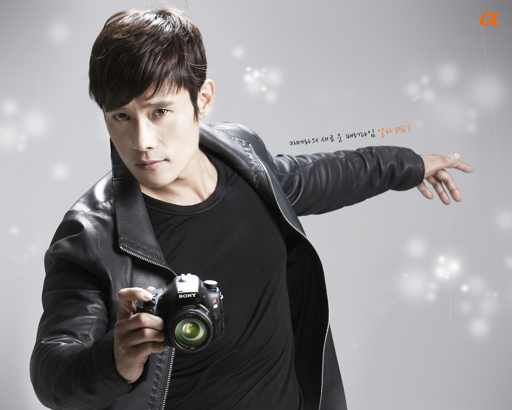 Description: A man holding a camera and pointing at it with his hand in his pocket and a white background with stars.