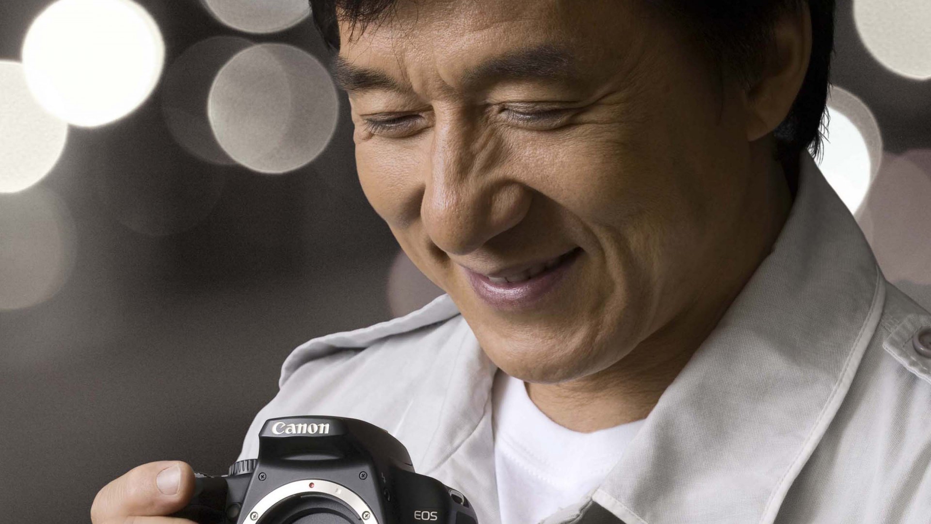 Description: A man holding a camera in his right hand and smiling at the camera with a blurry background of lights.