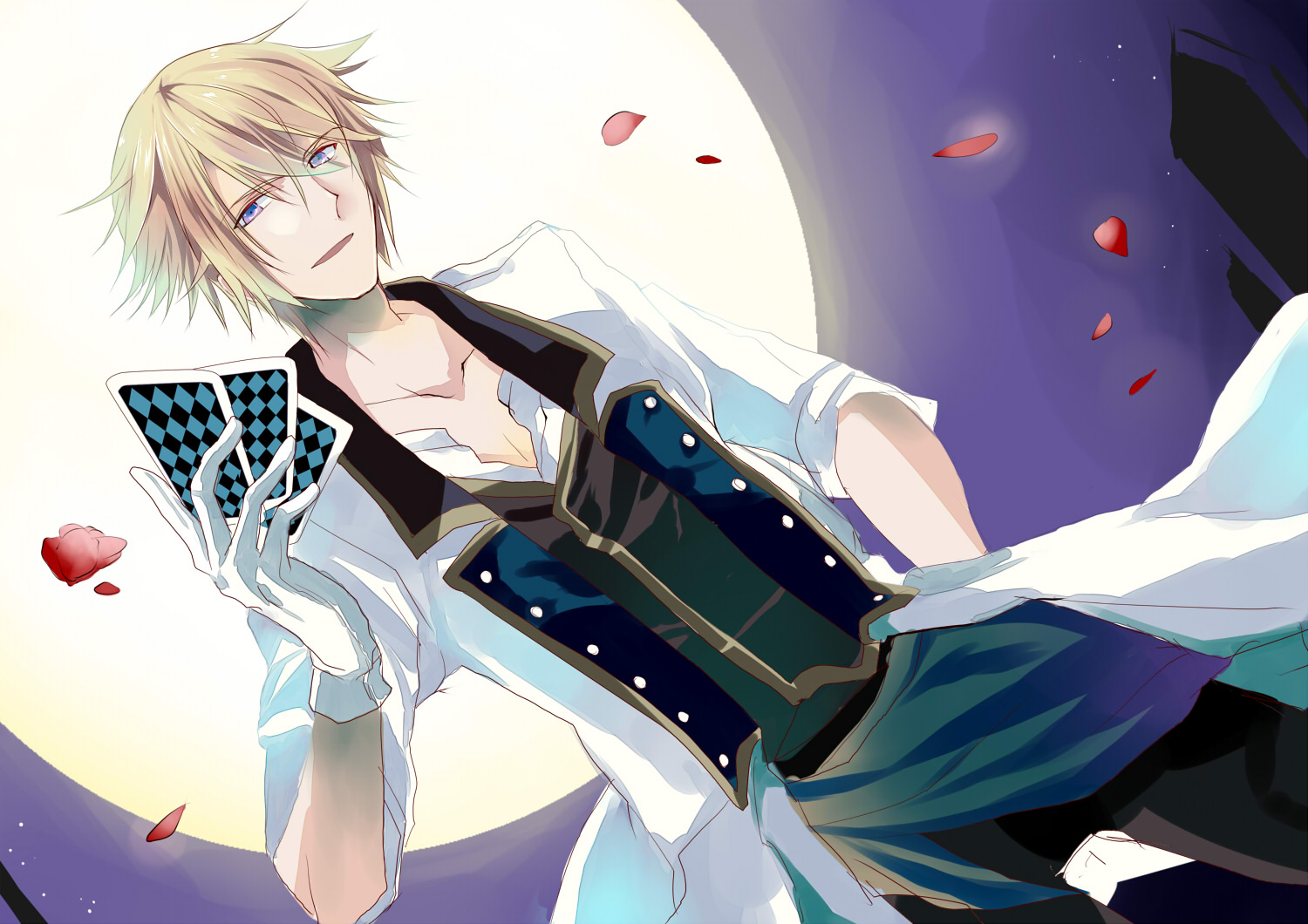 Description: A man holding a card in his hand with a moon in the background and blood on the ground behind him.