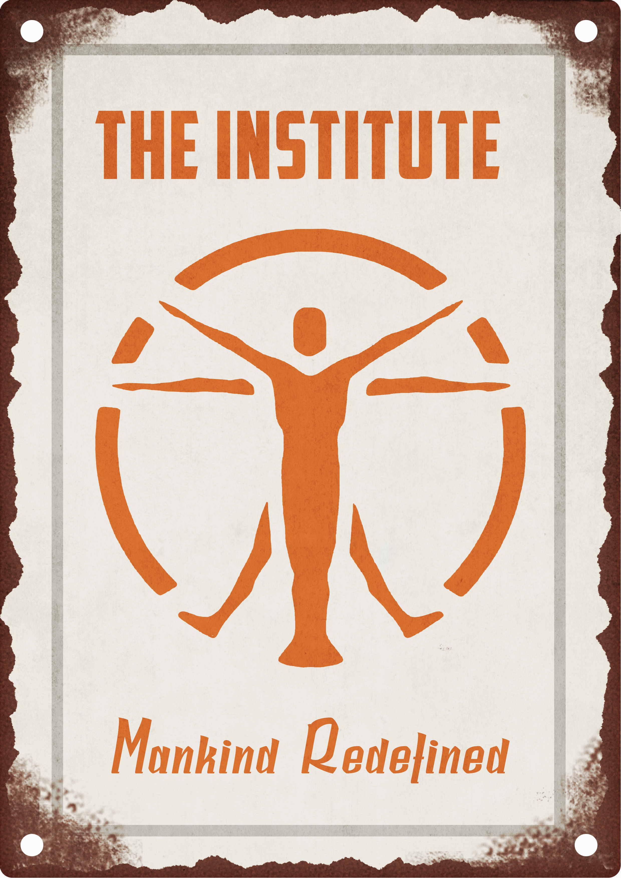 Description: A poster with a man holding a circle and the words the institute behind it in orange and white colors.