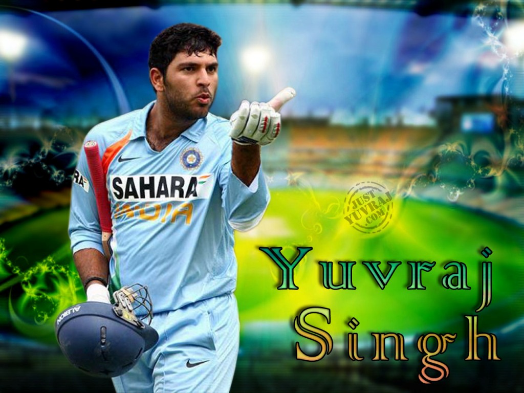 Description: A man holding a cricket ball and a bat in his hand with a stadium in the background with the words yuvrai singha written on it.