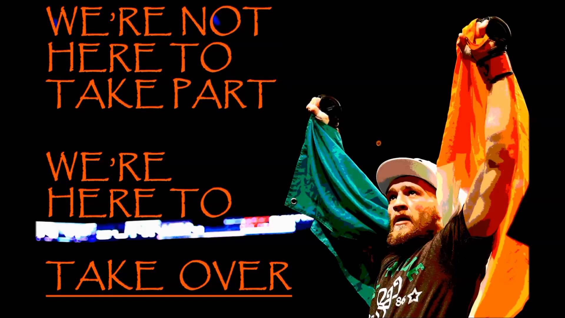 Description: A man holding a flag and a sign that says we're not here to take part we're here to take over.